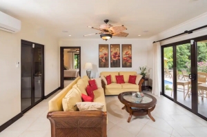Áreas abiertas de estar diseñadas para disfrutar de las vistas panorámicas desde todas las habitaciones. Ingrese a Casa a través de puertas dobles de vidrio y hierro al vestíbulo abierto con una hermosa escalera al nivel superior. El primer nivel cuenta con cocina totalmente equipada con todos los electrodomésticos de acero inoxidable, gabinetes personalizados con sobres de granito y todas las comodidades. Comedor abierto y áreas de estar completas con muebles Tommy Bahama y gabinetes empotrados a la medida. Mesa con capacidad para 6 personas y asientos en la barra de la cocina para 3. TV de pantalla plana con sonido envolvente, biblioteca de CD y DVD y base para iPod. Amplio dormitorio principal con cama matrimonial y baño principal con tocador de lavabo doble y sobre de mármol y una enorme ducha de cristal de esquina con vistas al jardín. Armarios empotrados con caja fuerte para objetos de valor. Puertas de vidrio que se abren al área de la piscina y la terraza con vista al arroyo en cascada. Arriba, 2 habitaciones matrimoniales cada una con baño privado. Vistas al océano y las montañas en cada uno. Tocadores de madera personalizados con sobres de mármol y armarios grandes. Ducha a ras de suelo en un baño y bañera / ducha en el segundo baño.