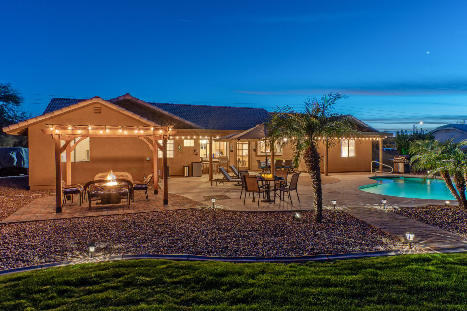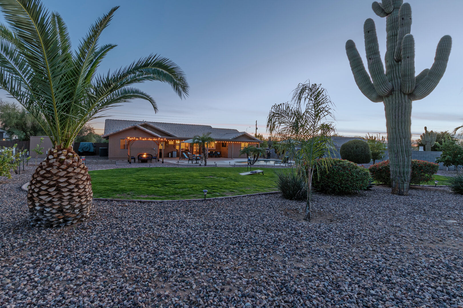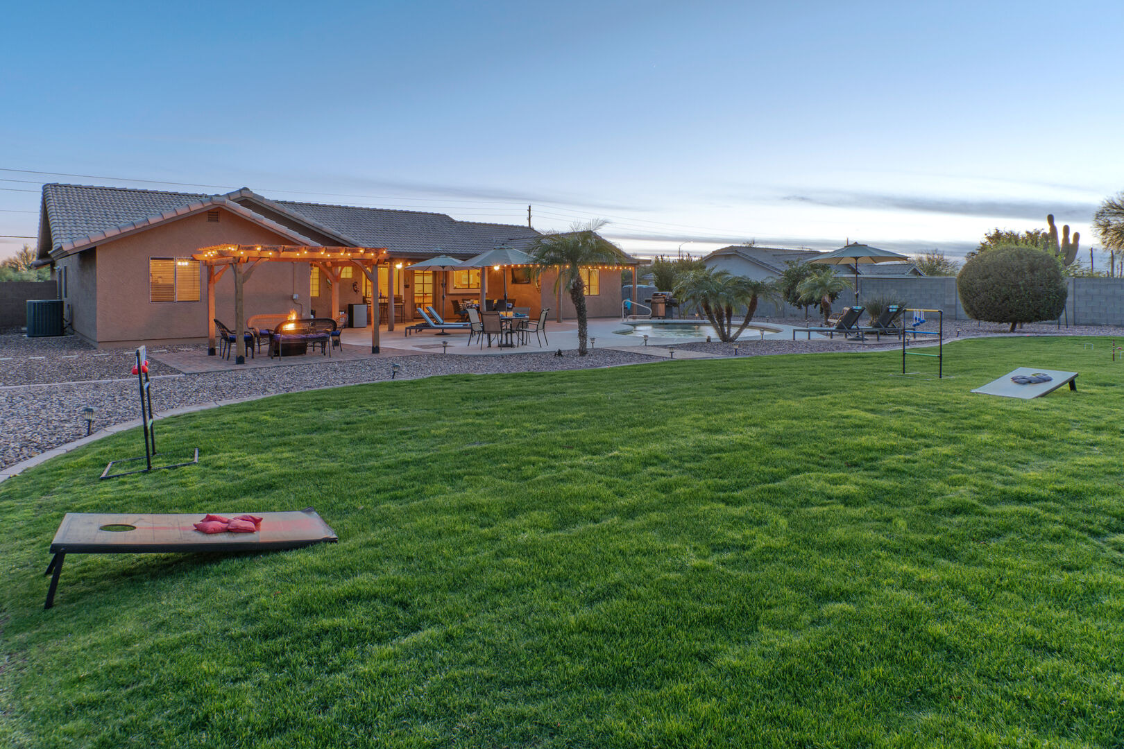 The lovely and private backyard space has a covered patio with dining furniture, an outdoor TV and a propane heater. There are chaises for relaxing poolside plus a gathering area around the propane fire pit. A large grassy area is set up for corn hole contests.