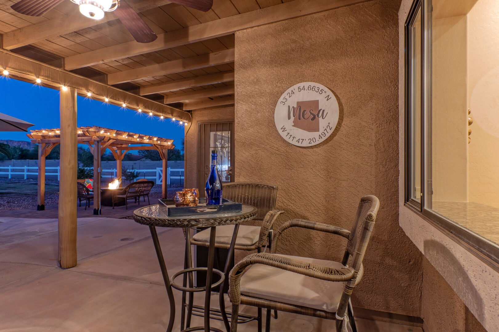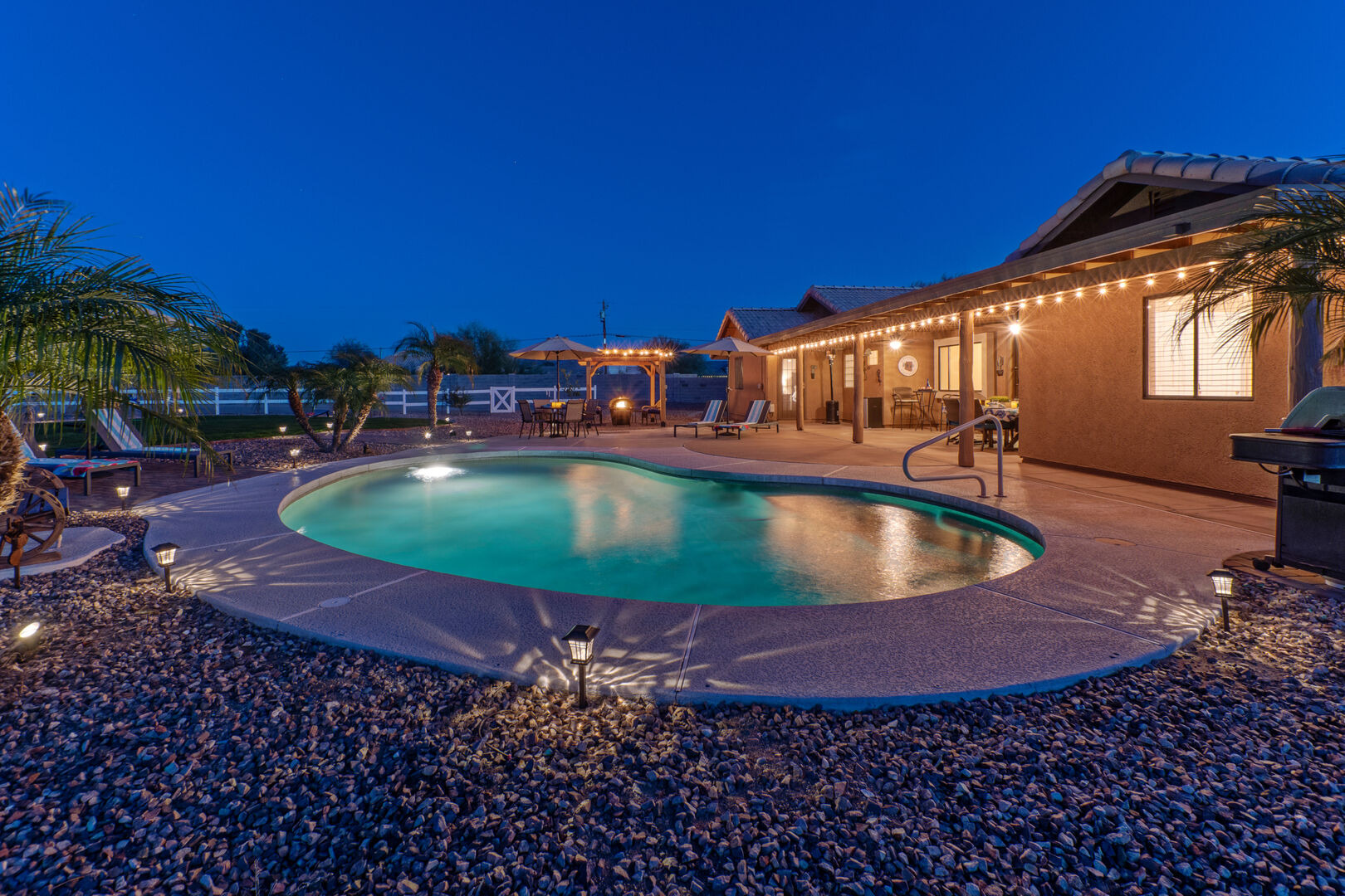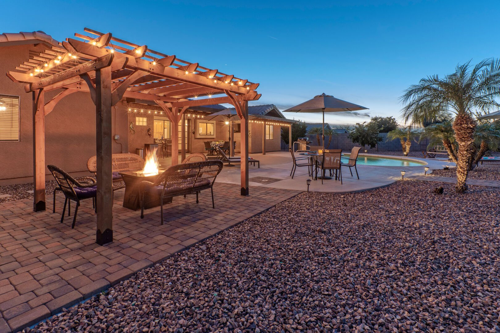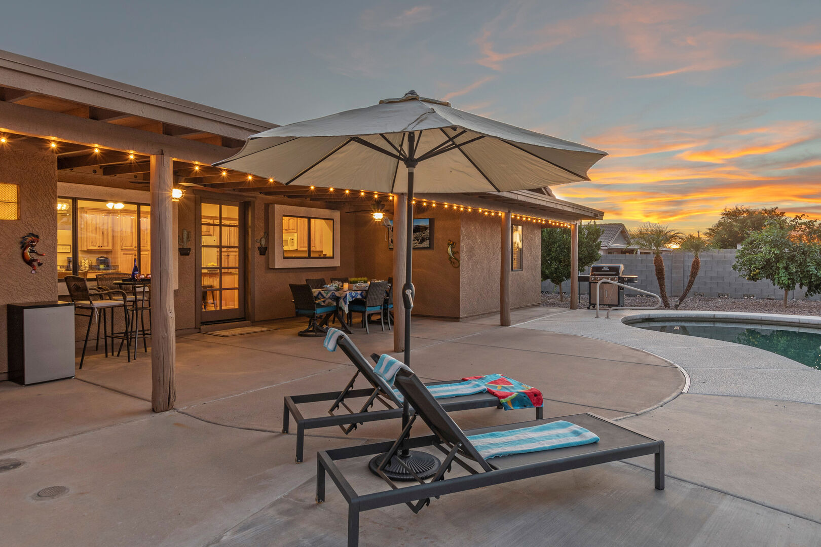 The lovely and private backyard space has a covered patio with dining furniture, an outdoor TV and a propane heater. There are chaises for relaxing poolside plus a gathering area around the propane fire pit. A large grassy area is set up for corn hole contests.