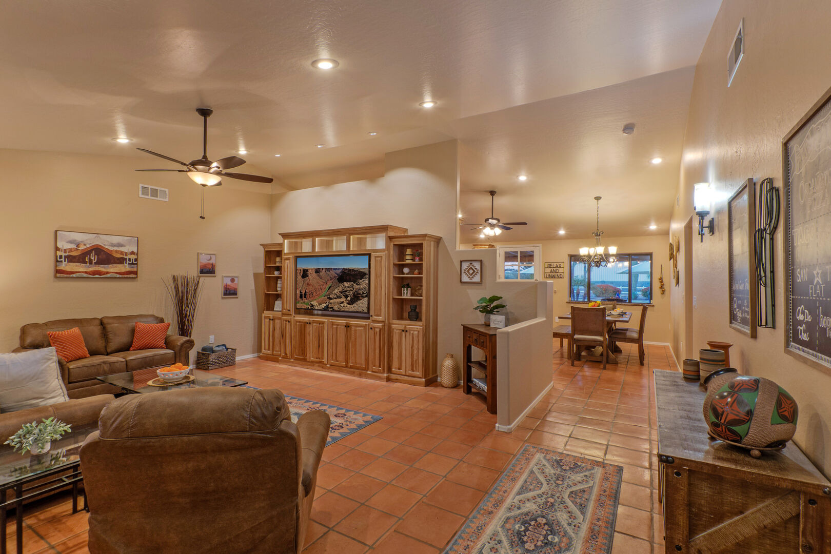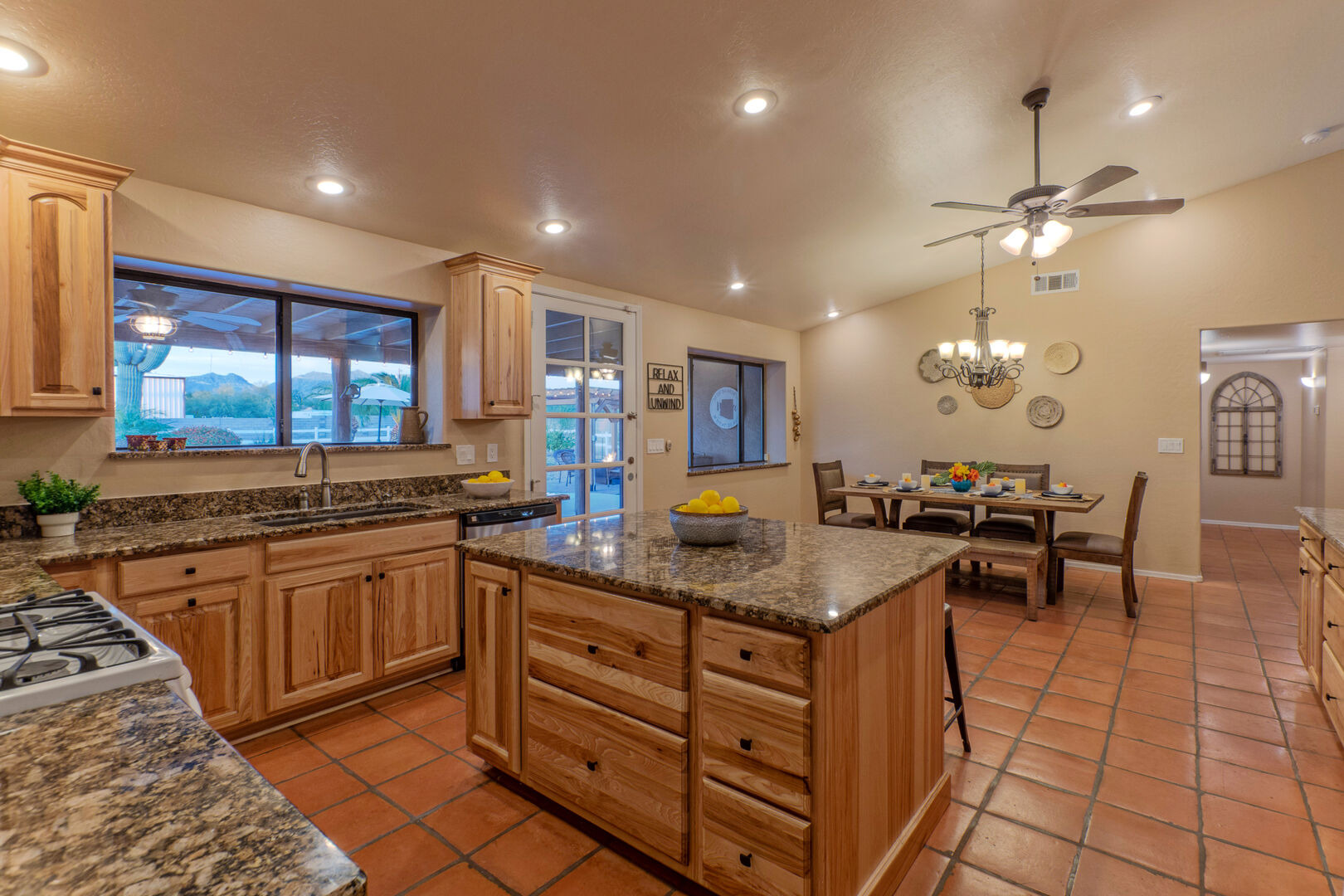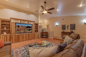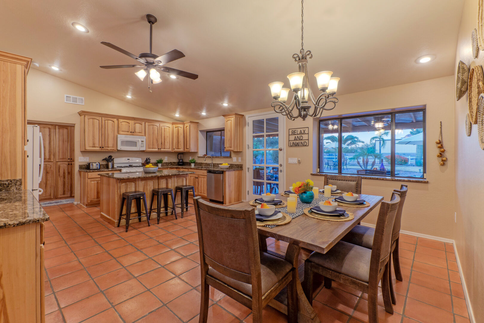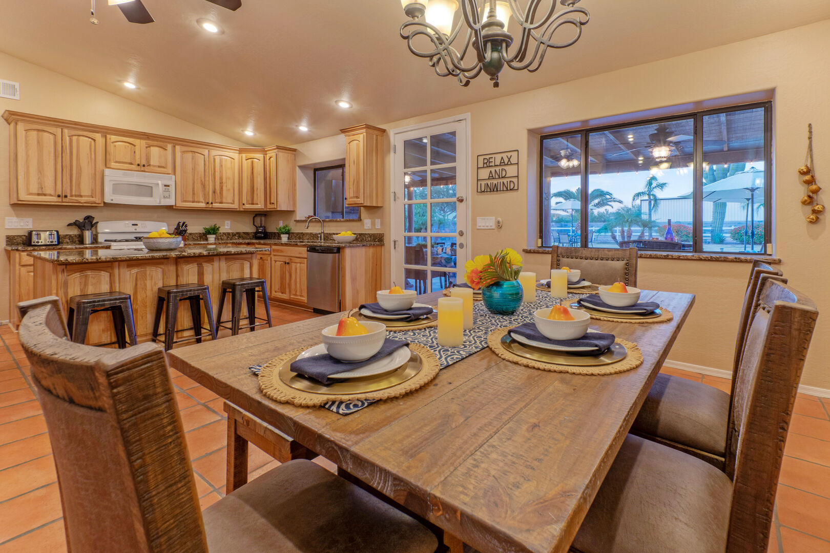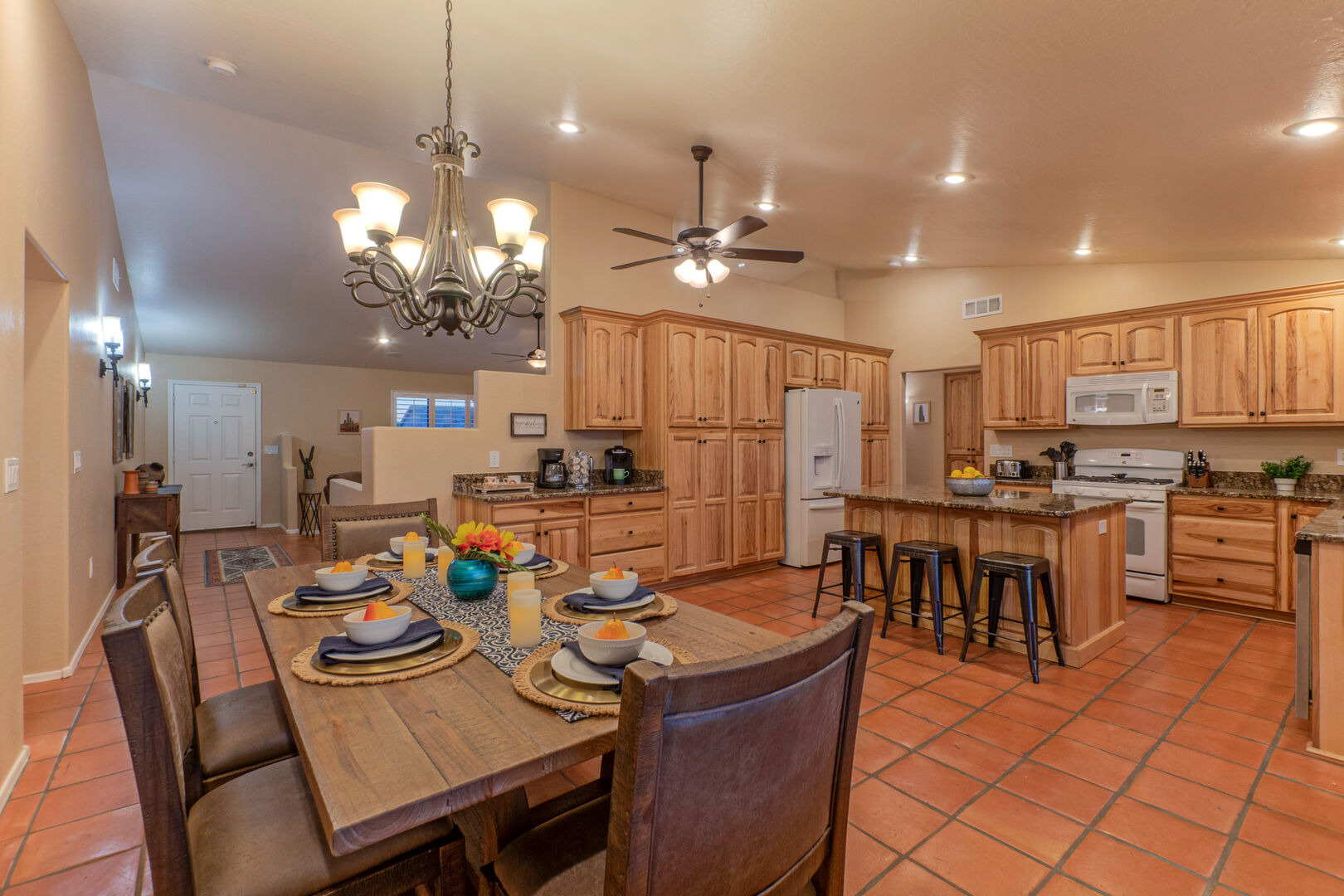 Our home features an open floor plan with attractive southwestern decor and new floors. The great room has a smart TV with comfortable seating for many. The spacious and well stocked kitchen has island seating and opens into a dining area with table seating for 6. The chef will love the counter space for prepping and serving a delectable feast. Both Keurig and drip coffee makers are ready to brew your favorite roast. Between the kitchen and dining area are doors that access the pool and covered patio. Wifi is complimentary. Highchairs and Pack 'N Plays are available to rent.