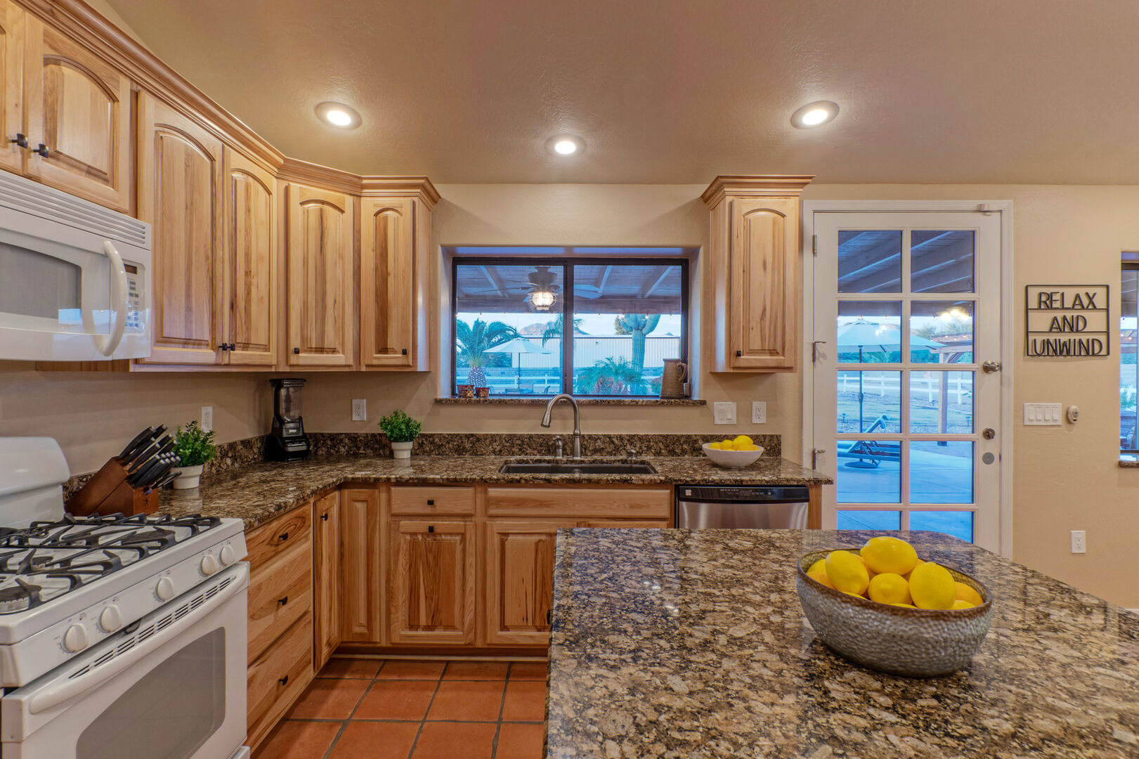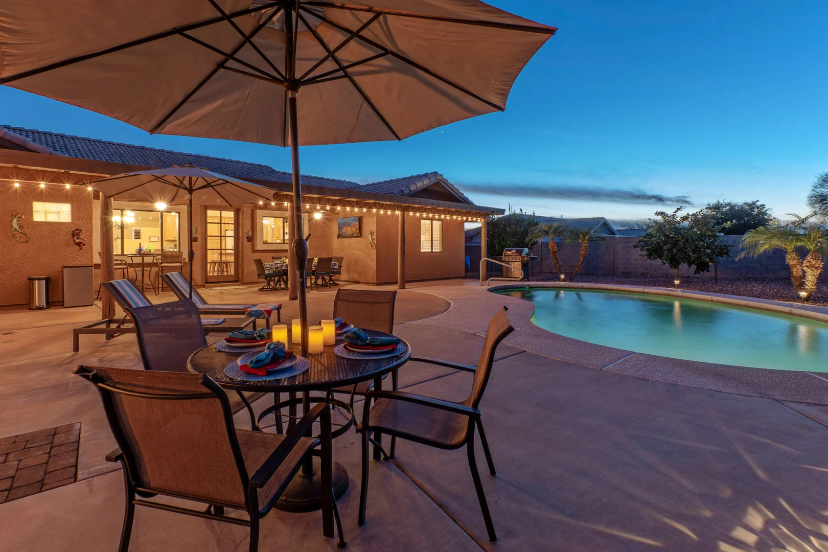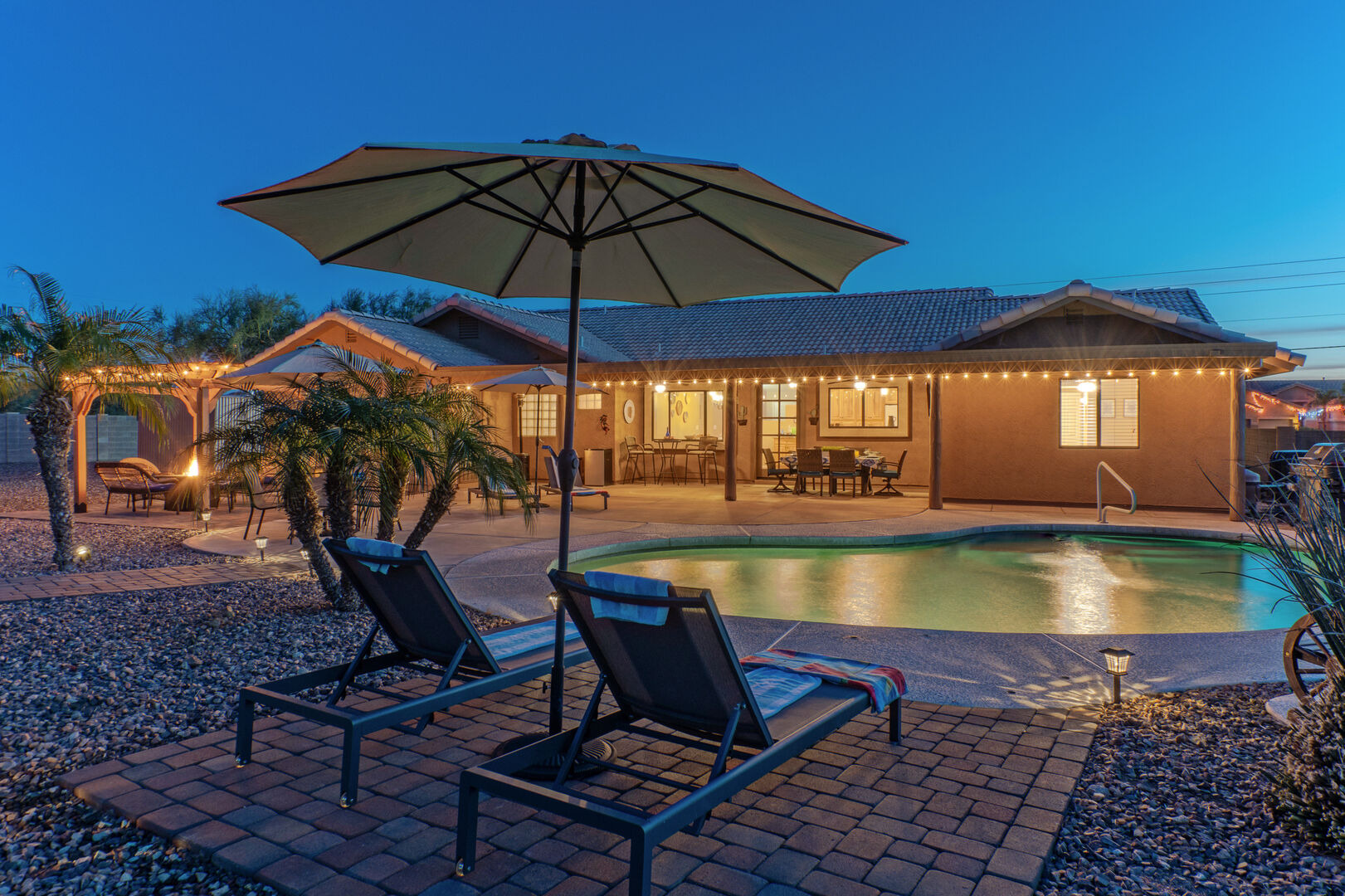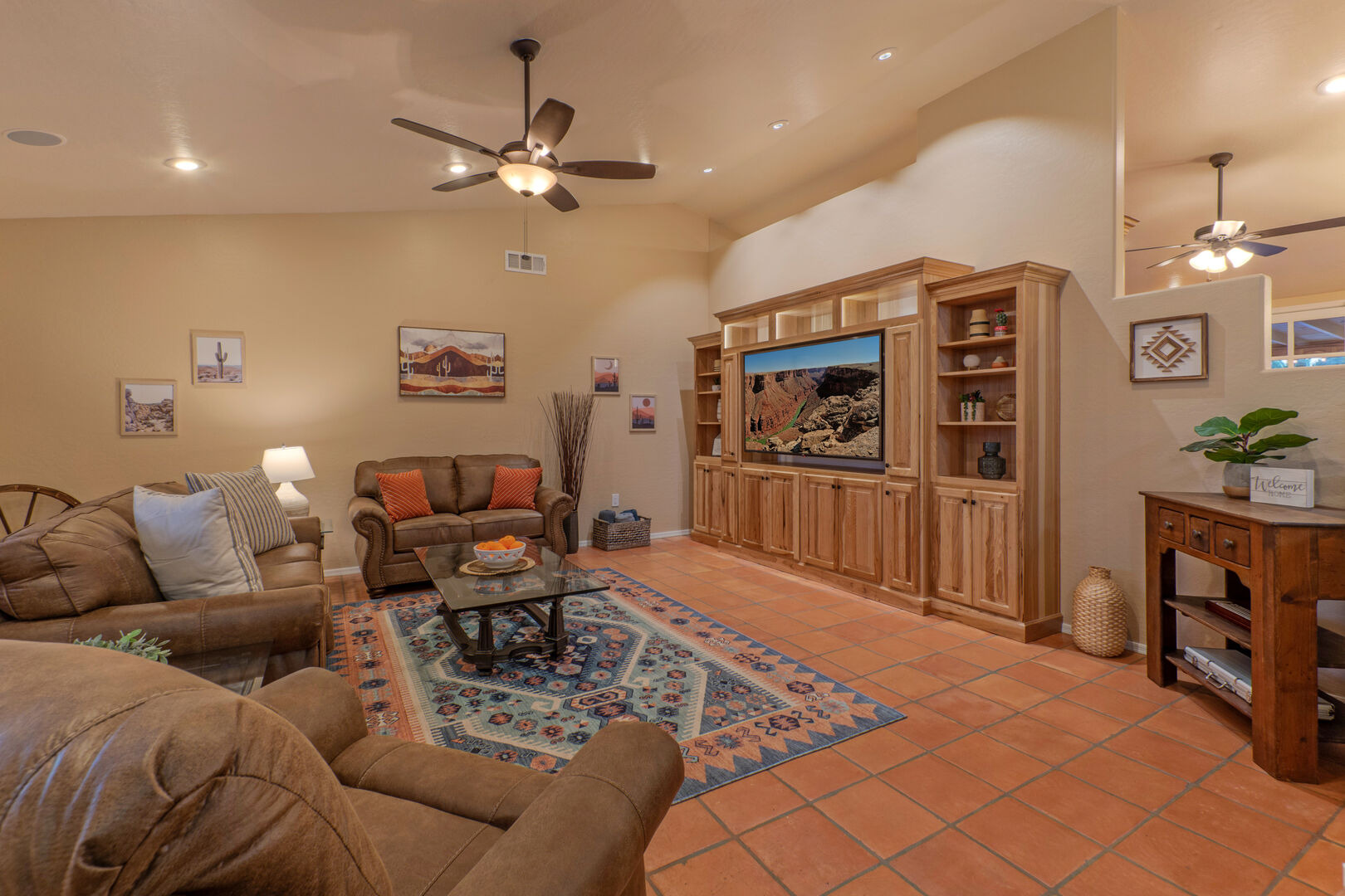 Our home features an open floor plan with attractive southwestern decor and new floors. The great room has a smart TV with comfortable seating for many. The spacious and well stocked kitchen has island seating and opens into a dining area with table seating for 6. The chef will love the counter space for prepping and serving a delectable feast. Both Keurig and drip coffee makers are ready to brew your favorite roast. Between the kitchen and dining area are doors that access the pool and covered patio. Wifi is complimentary. Highchairs and Pack 'N Plays are available to rent.