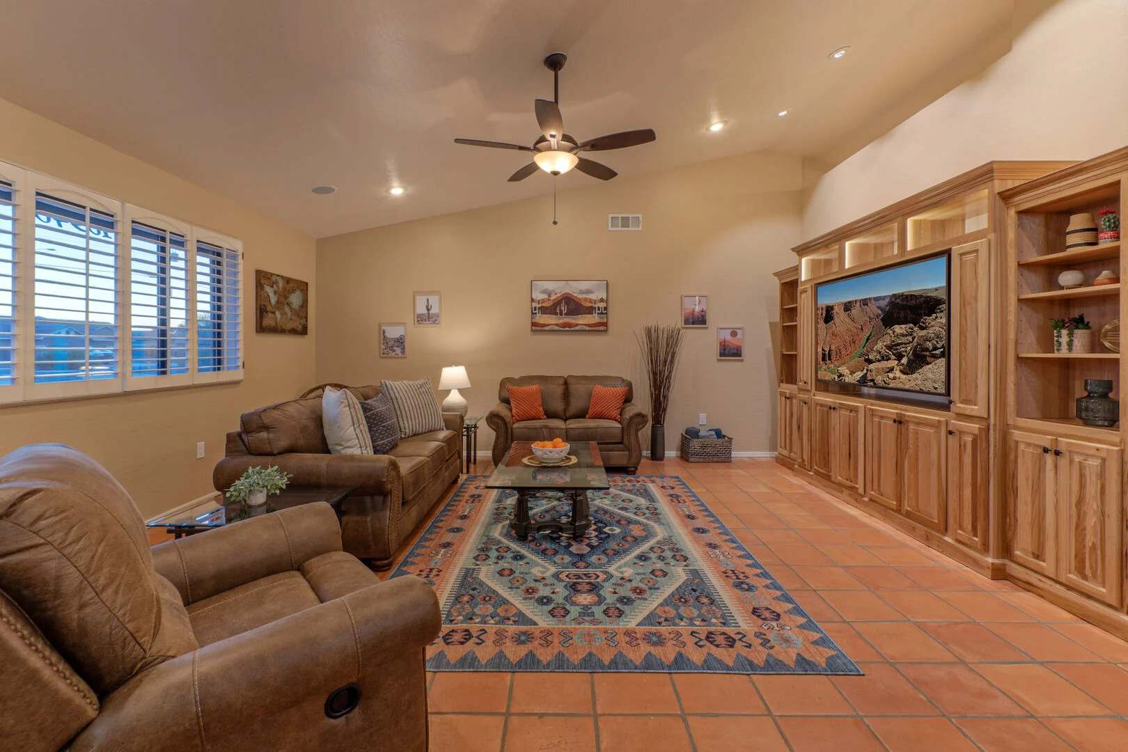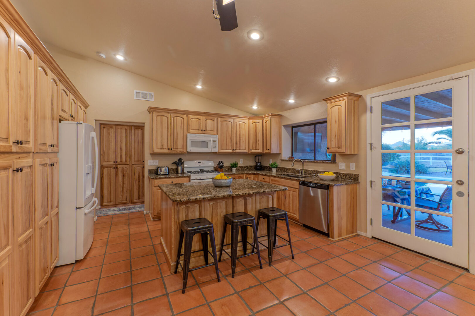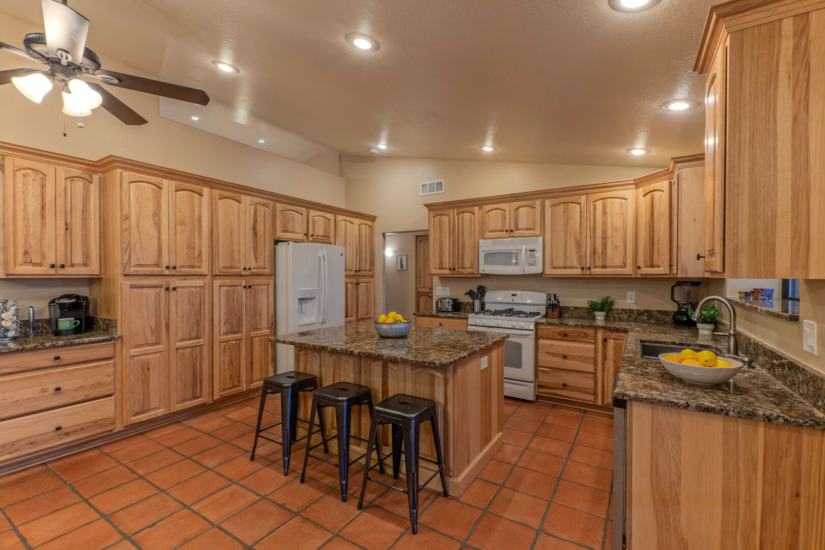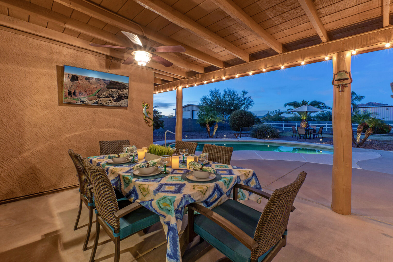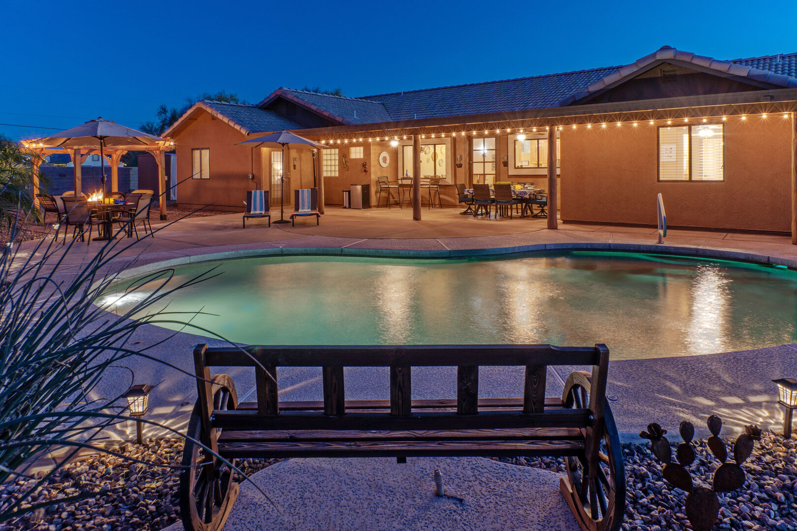 Our home features an open floor plan with attractive southwestern decor and new floors. The great room has a smart TV with comfortable seating for many. The spacious and well stocked kitchen has island seating and opens into a dining area with table seating for 6. The chef will love the counter space for prepping and serving a delectable feast. Both Keurig and drip coffee makers are ready to brew your favorite roast. Between the kitchen and dining area are doors that access the pool and covered patio. Wifi is complimentary. Highchairs and Pack 'N Plays are available to rent.