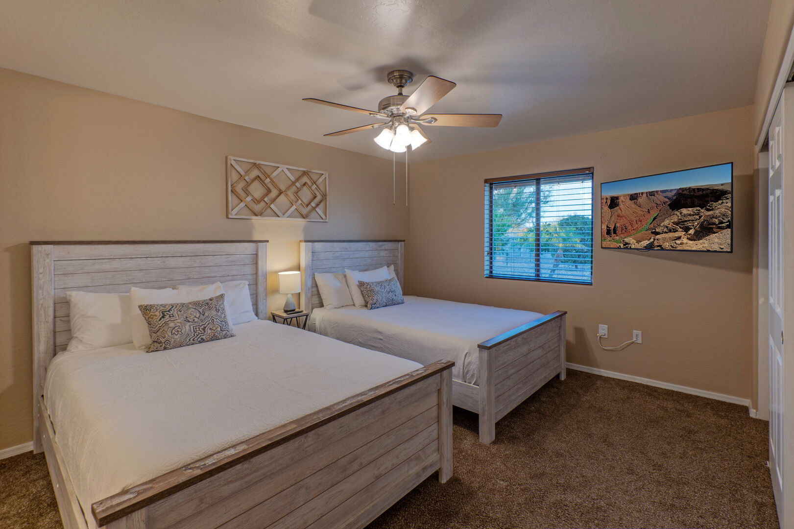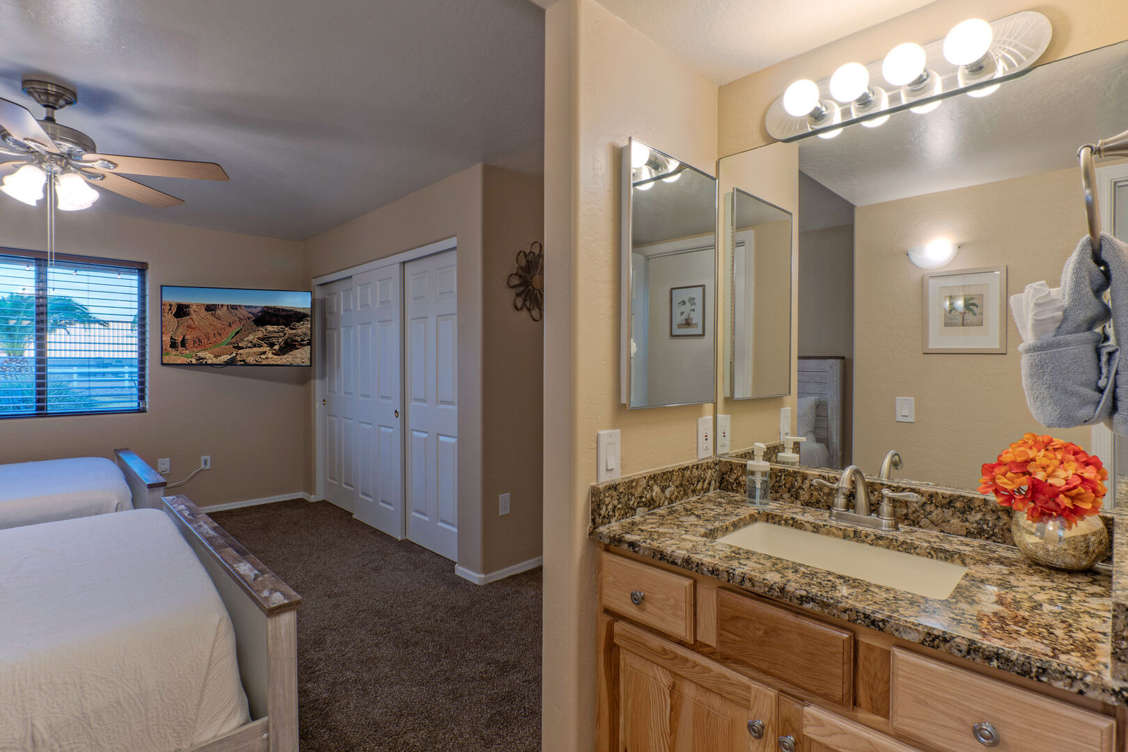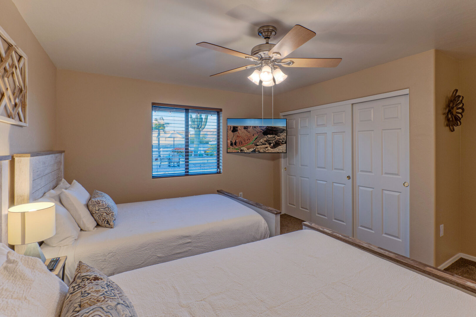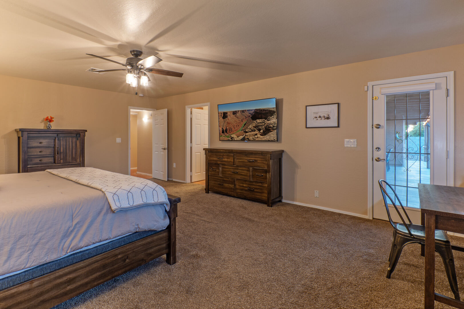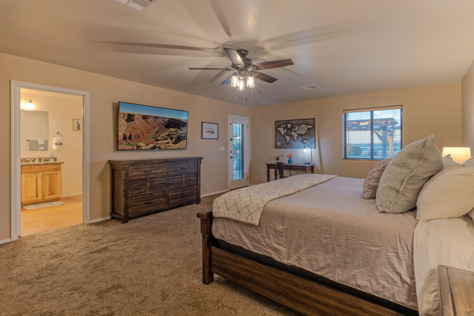 The bedroom floor plan is split and ALL bedrooms have TVs and ceiling fans. The primary bedroom includes a king bed, 65 inch TV, walk-in closet, desk for your remote work and a door to access the backyard and pool. The en suite primary bath features a walk-in shower and dual vanity sinks.