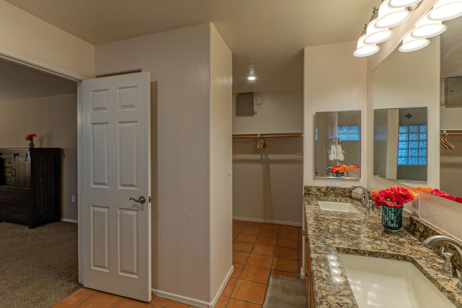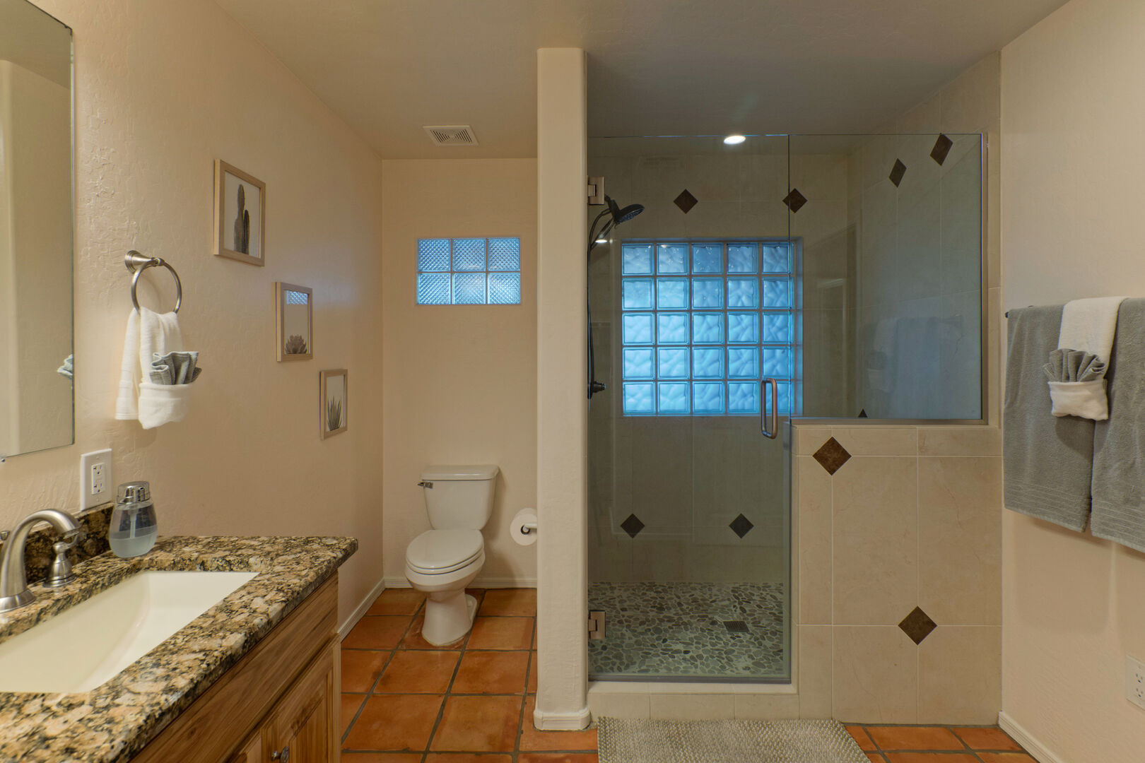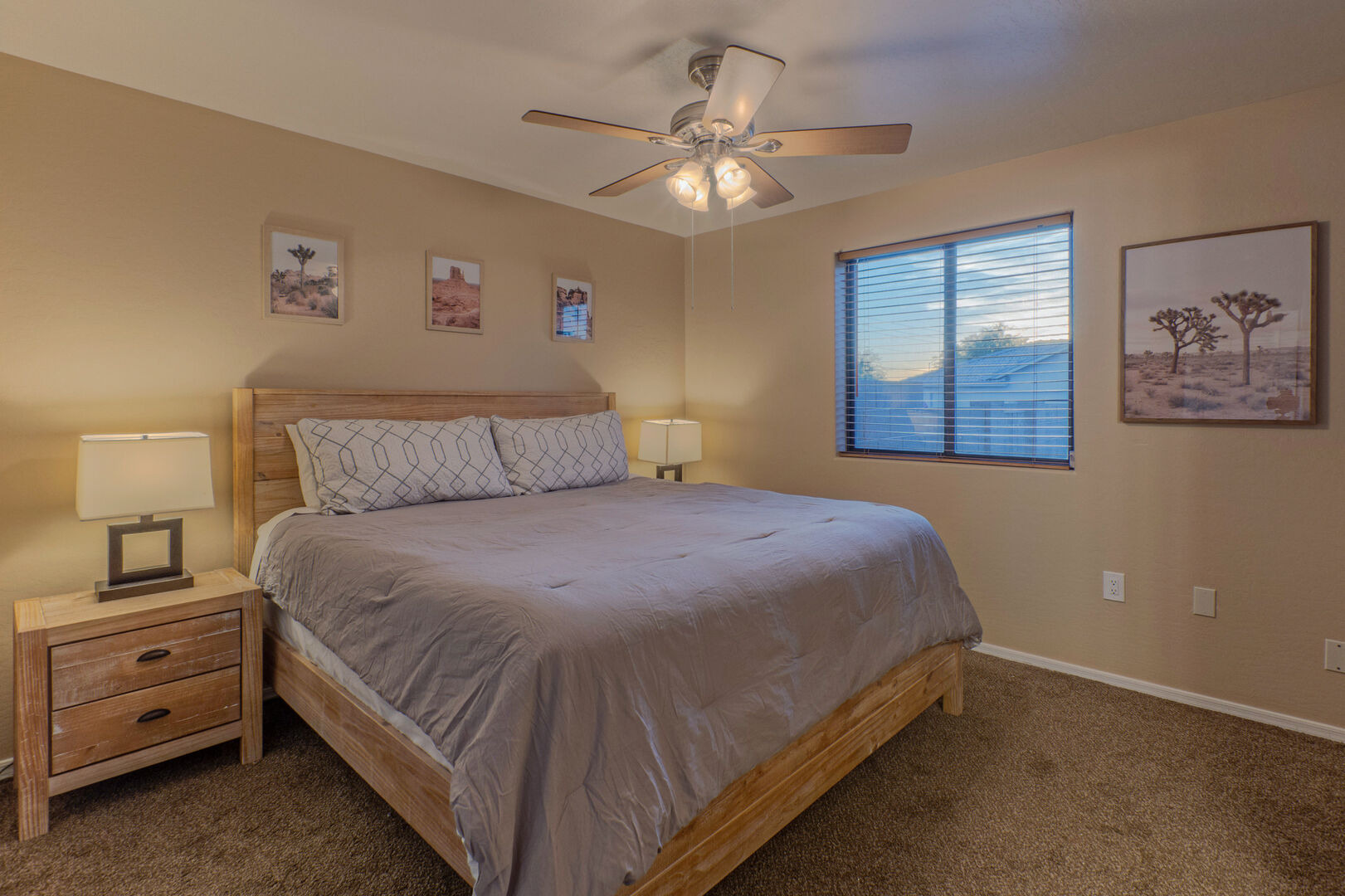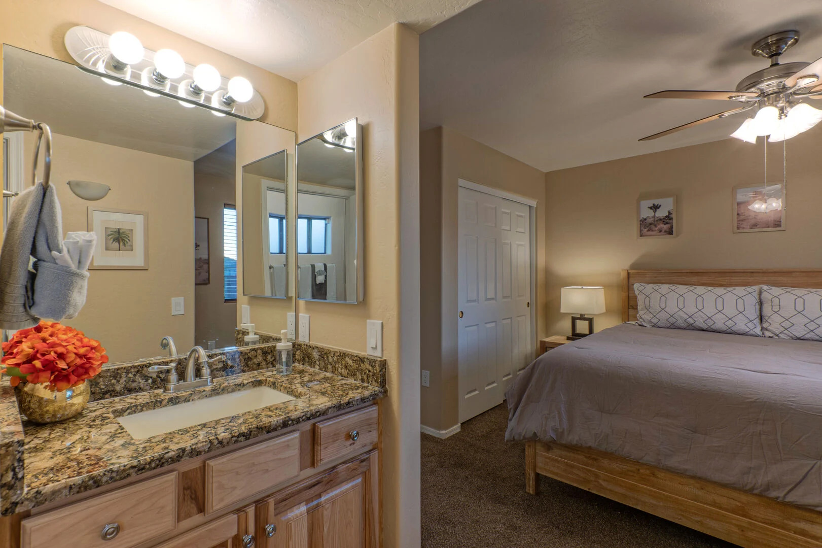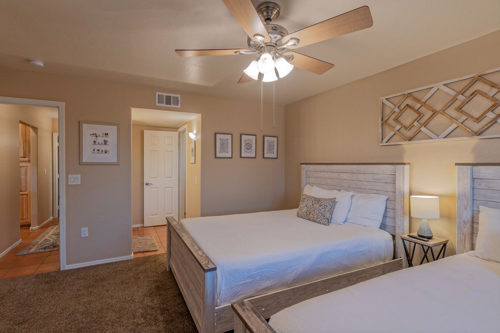 The bedroom floor plan is split and ALL bedrooms have TVs and ceiling fans. The primary bedroom includes a king bed, 65 inch TV, walk-in closet, desk for your remote work and a door to access the backyard and pool. The en suite primary bath features a walk-in shower and dual vanity sinks.
