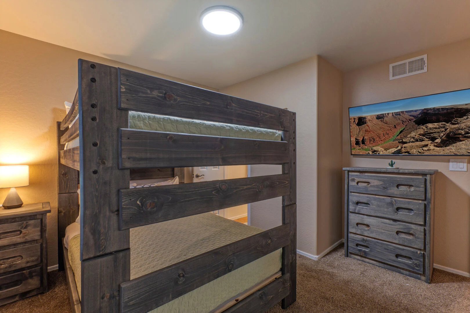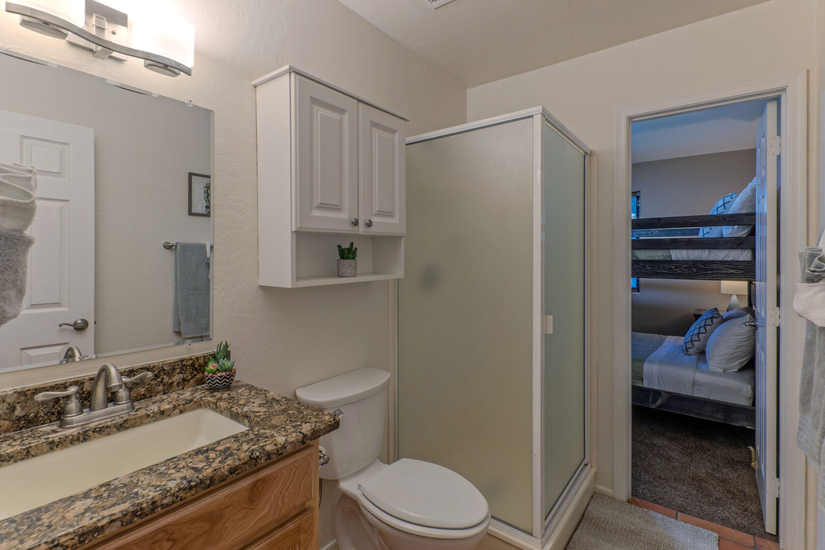 Bedroom 2 has full size bunk beds with top safety rails and a TV. Bedroom 2 and visitors share Bathroom 2 which features a shower and 2 doors. Bedroom 3 has a king bed and Bedroom 4 has two queen beds. Bedrooms 3 and 4 share a Jack and Jill style bath with private vanities and a shared walk-in shower and commode. There is ample storage space for your personal items in each bedroom. A hair dryer and soap are supplied.