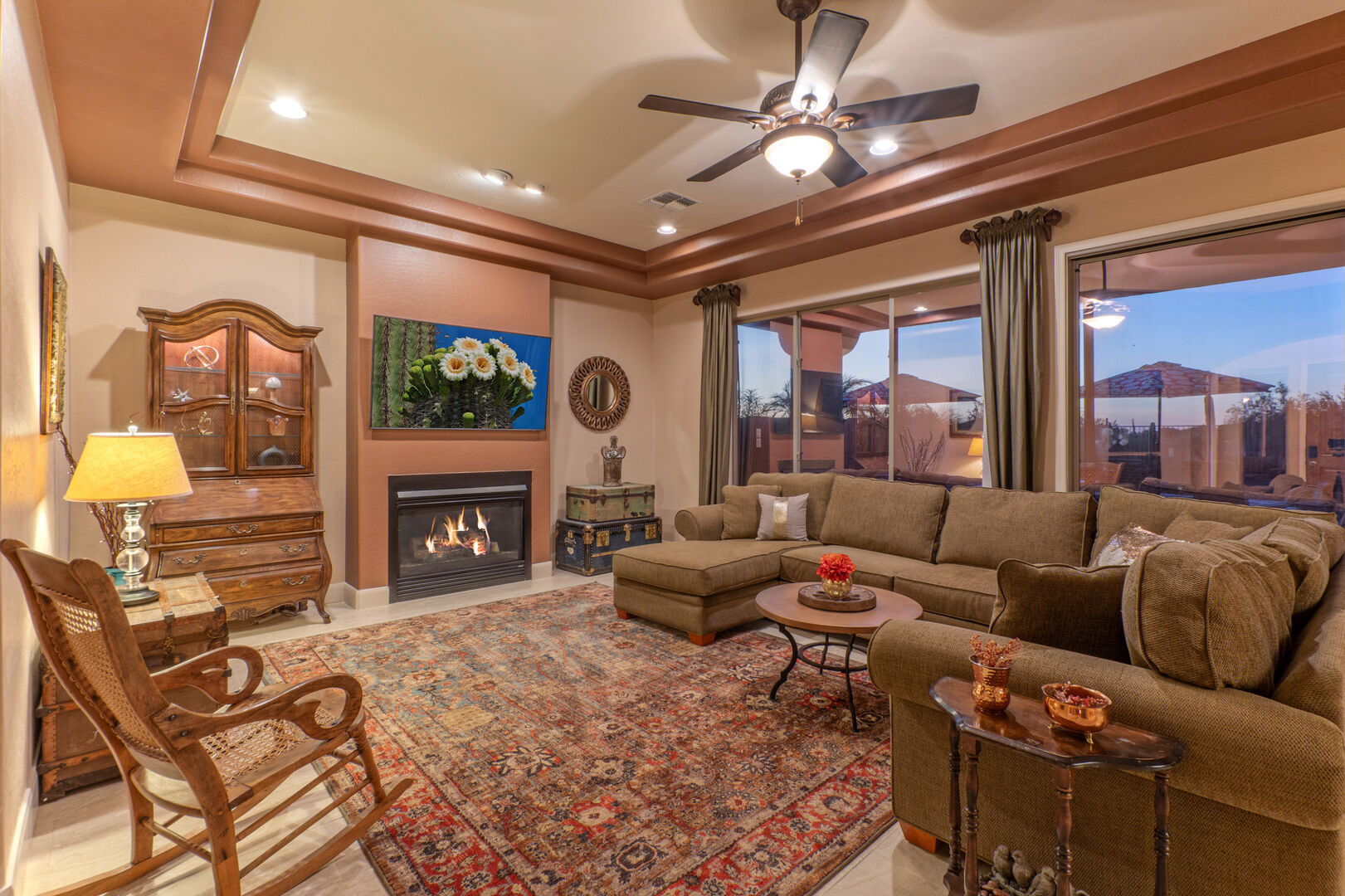 Sliding doors at the back of the home allow access to the patio and pool deck, making it easy to transfer food and drinks. With favorite beverage in hand, enjoy the stunning views of the iconic Superstition Mountains and sunsets from the covered patio or pool deck. When the evenings turn cool, warm yourself in front of the gas fire pit. Life is grand in Gold Canyon!