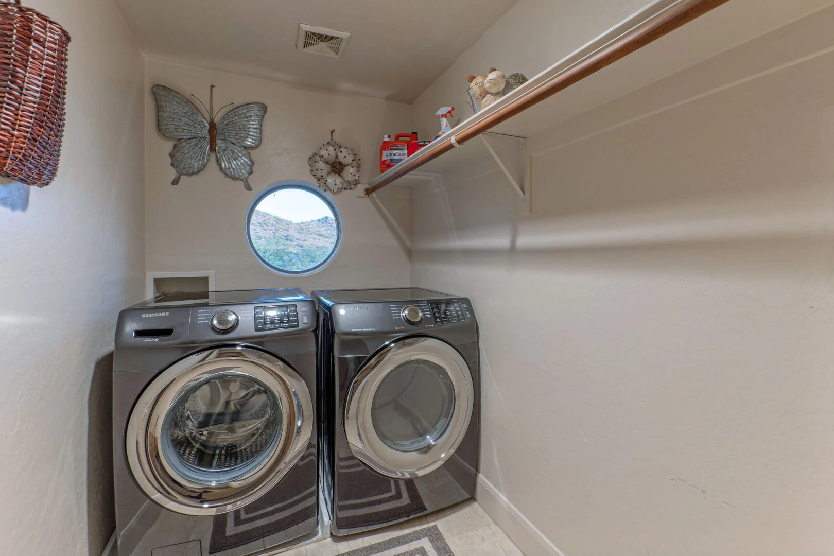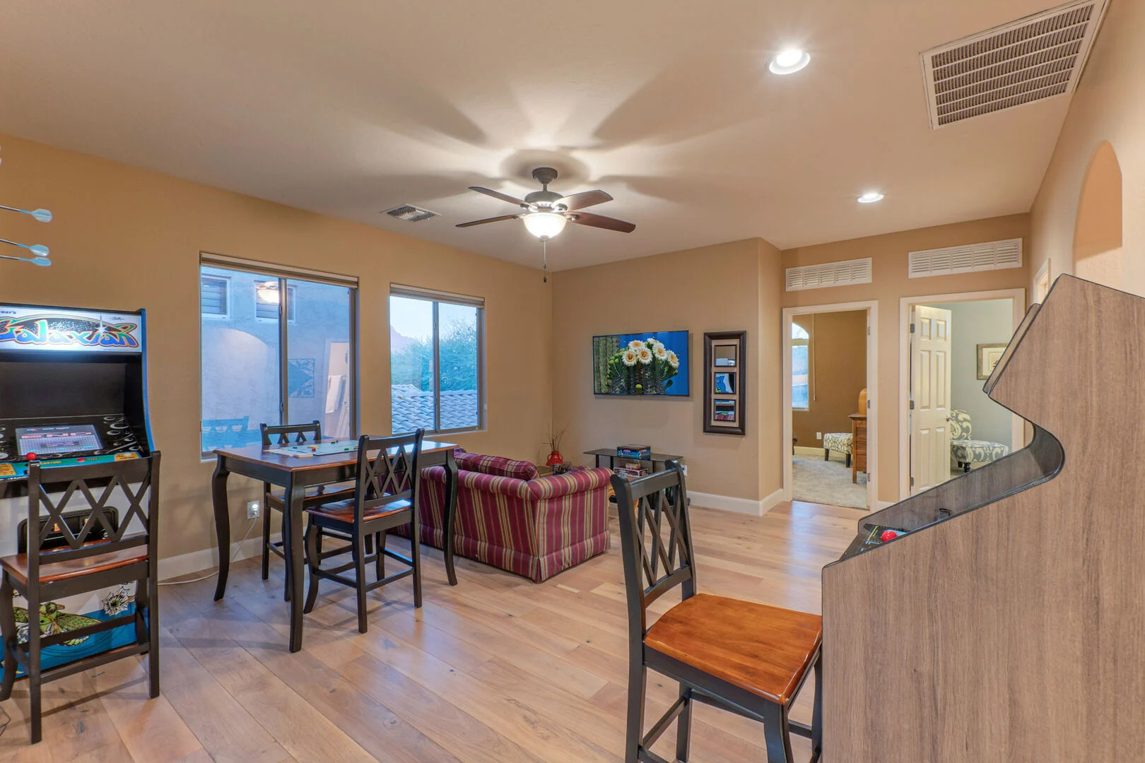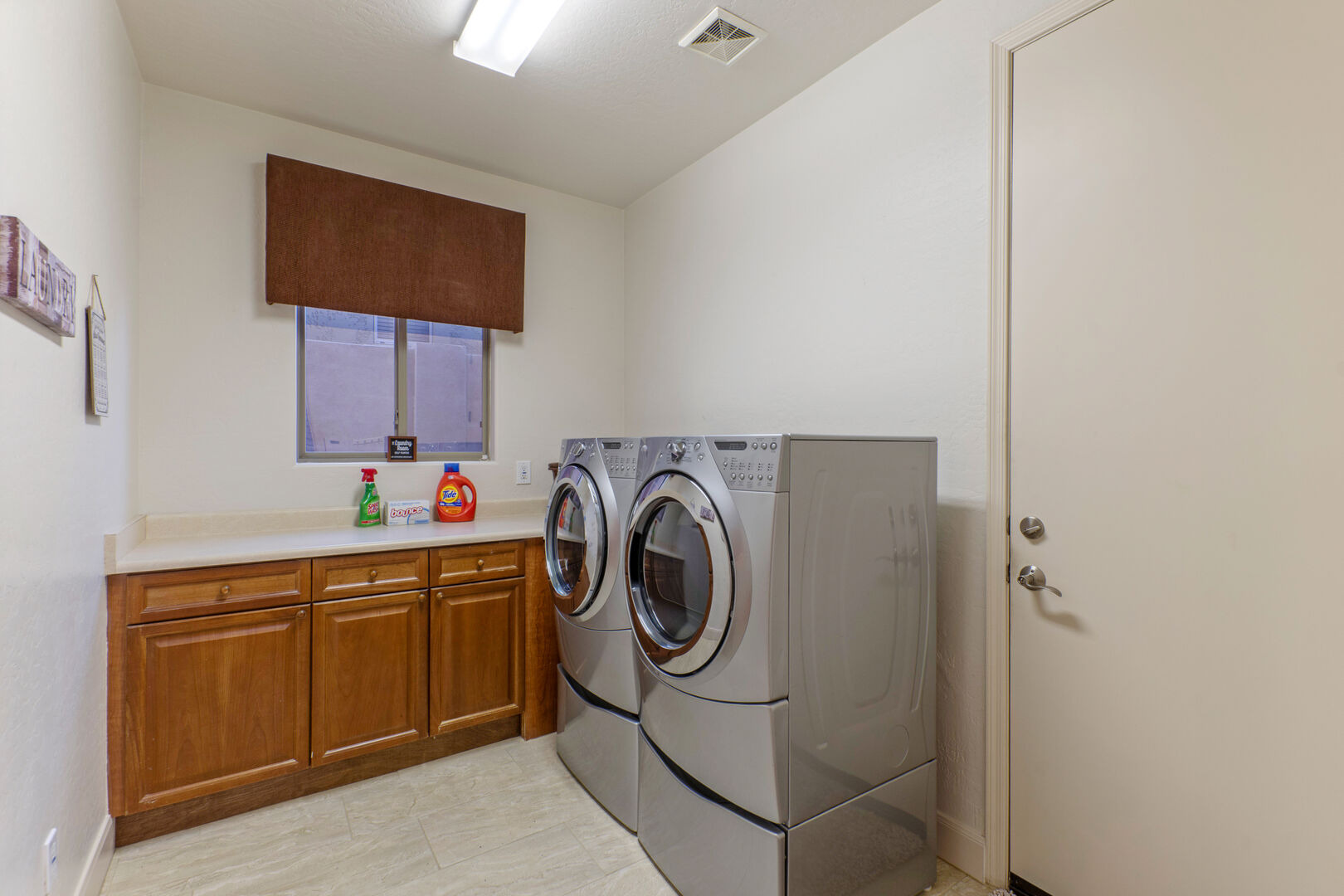 The small front facing garage bay has been converted to a theater room where you can immerse yourself in action and adventure experiences on the large screen. Two fully stocked laundry rooms, one upstairs and one on the ground floor, help you keep your wardrobe ready for your Arizona adventures. There are 2 garage spaces for cars and additional parking for one vehicle on the driveway.
