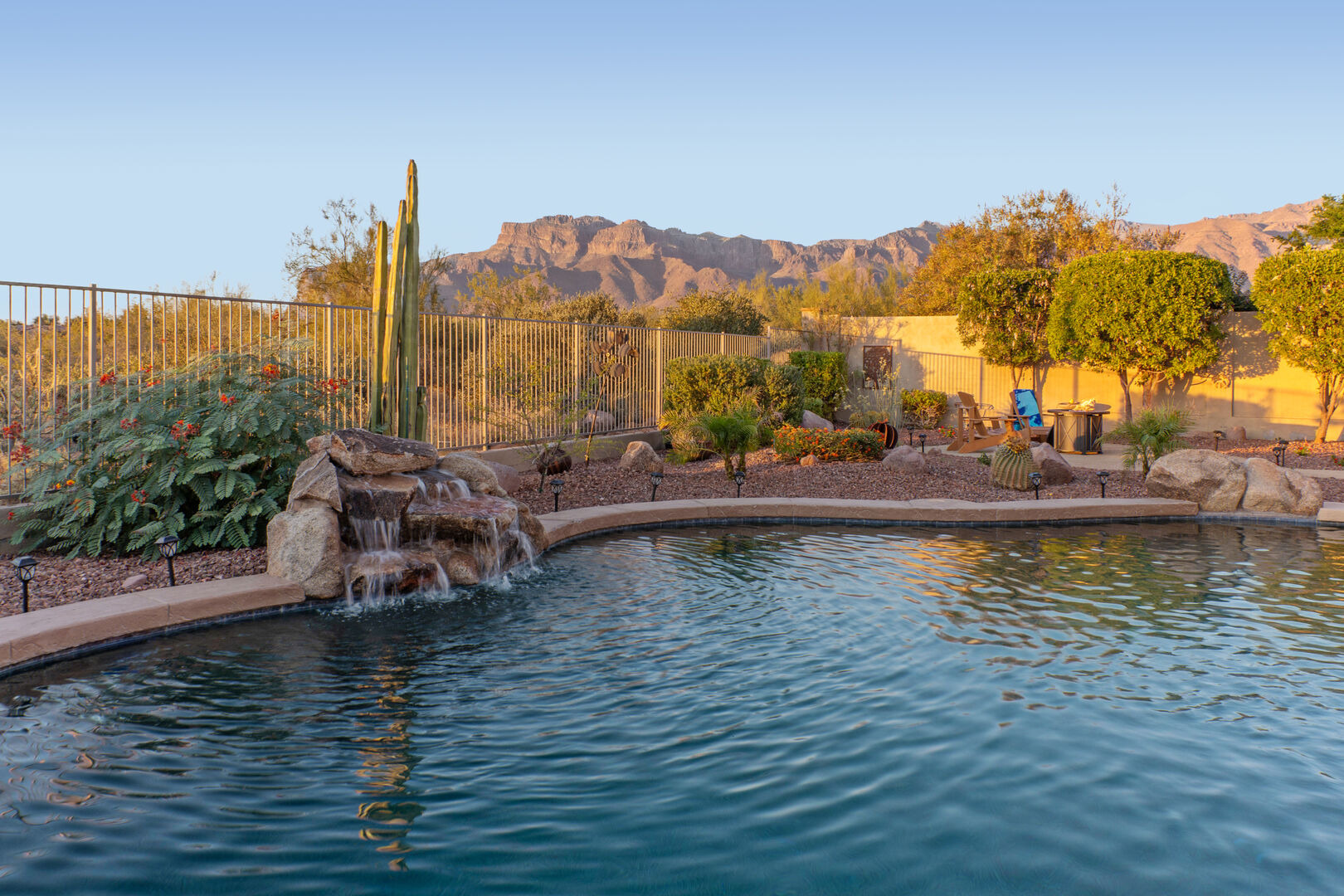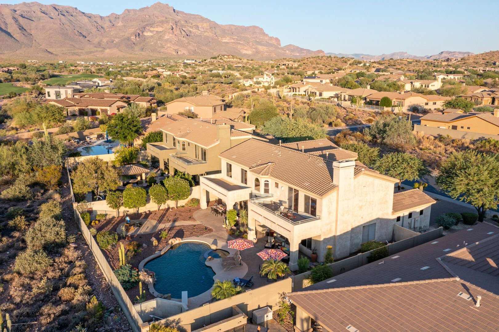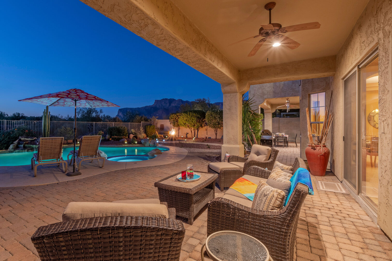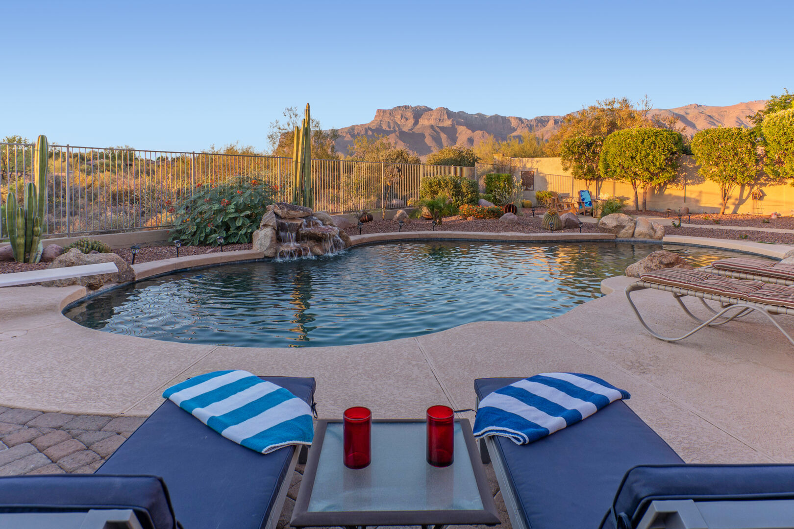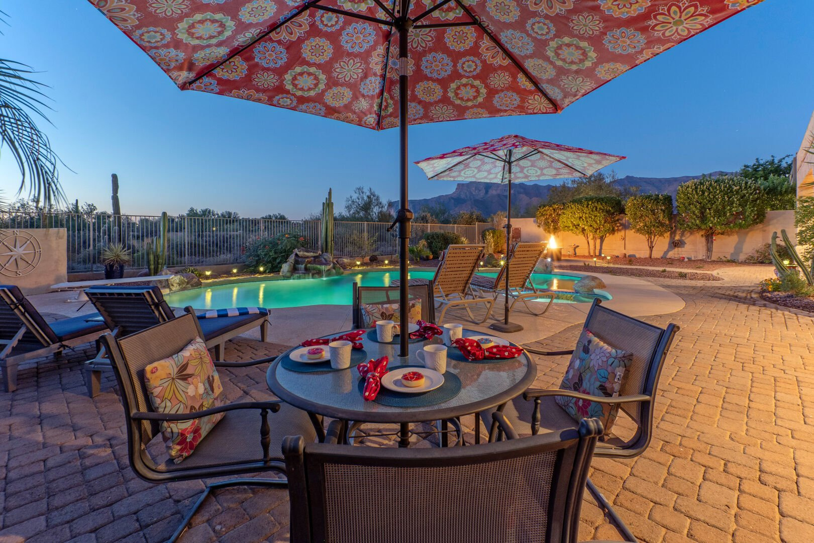 Welcome to Arizona Daydream, our 6 BR, 4 BA, two story, 5000+ sq ft home in beautiful and family friendly Gold Canyon. Enjoy the private backyard amenities that include a 9 ft deep diving pool with optional heat, built-in spa, fire pit and covered patio furnished for dining and relaxing. The pool heating fee is $85.00 per day to heat the pool to 80º F.