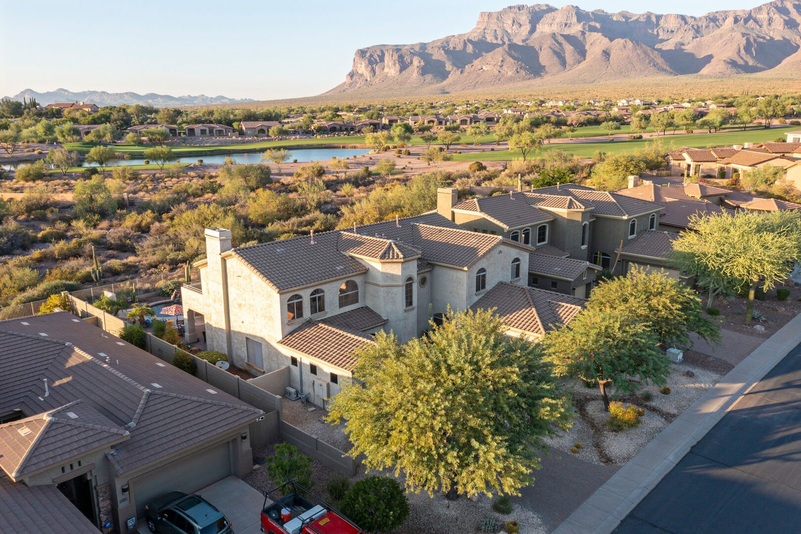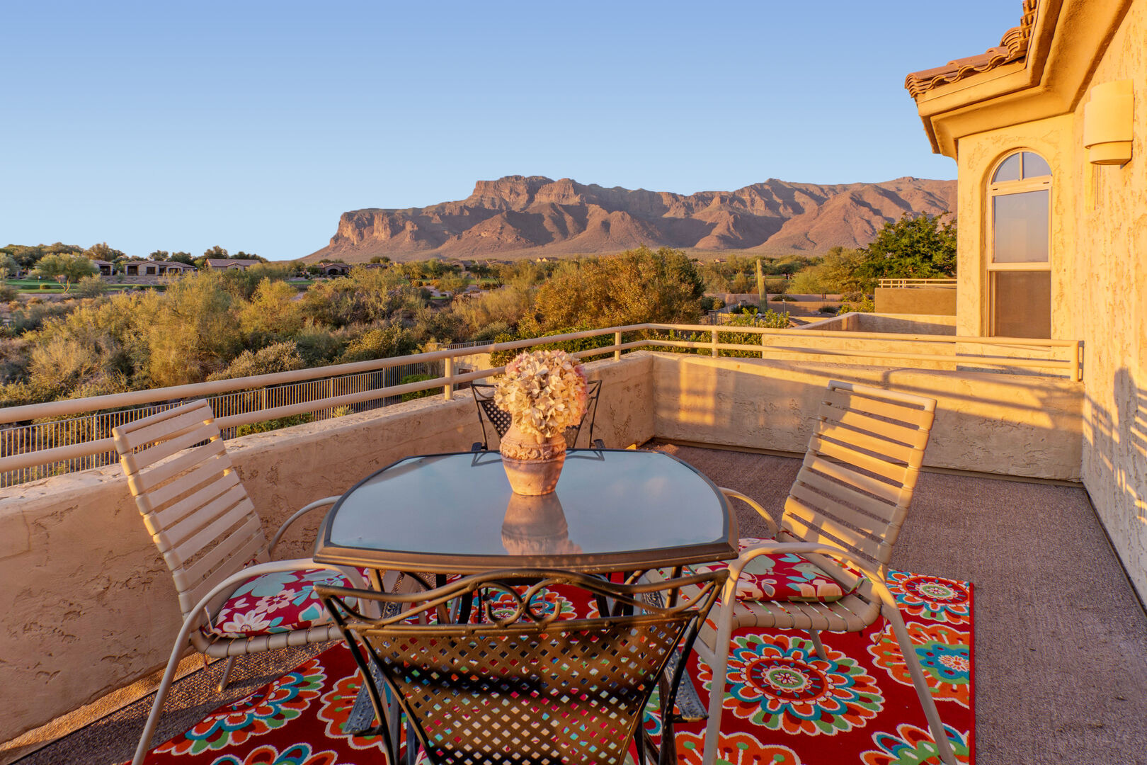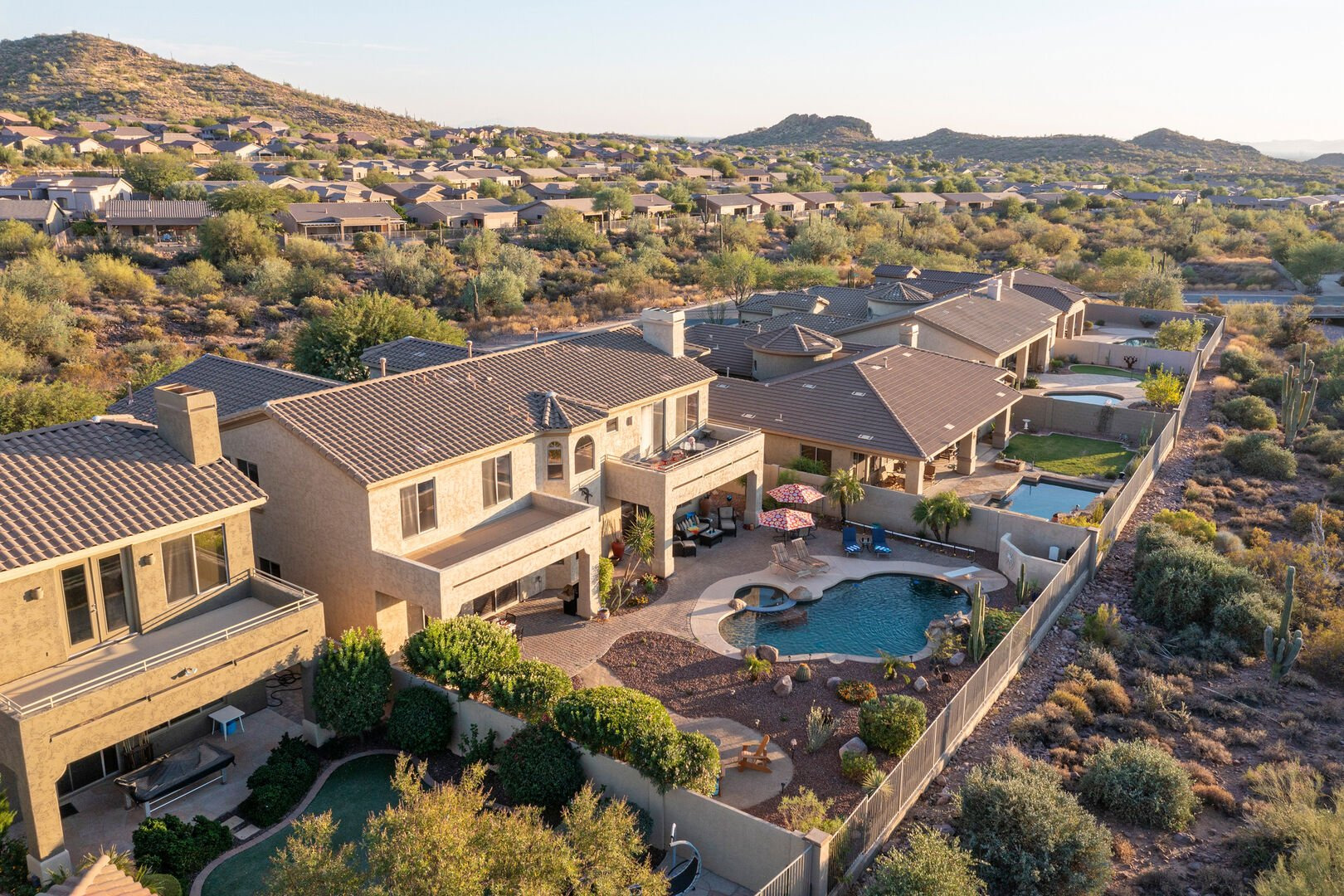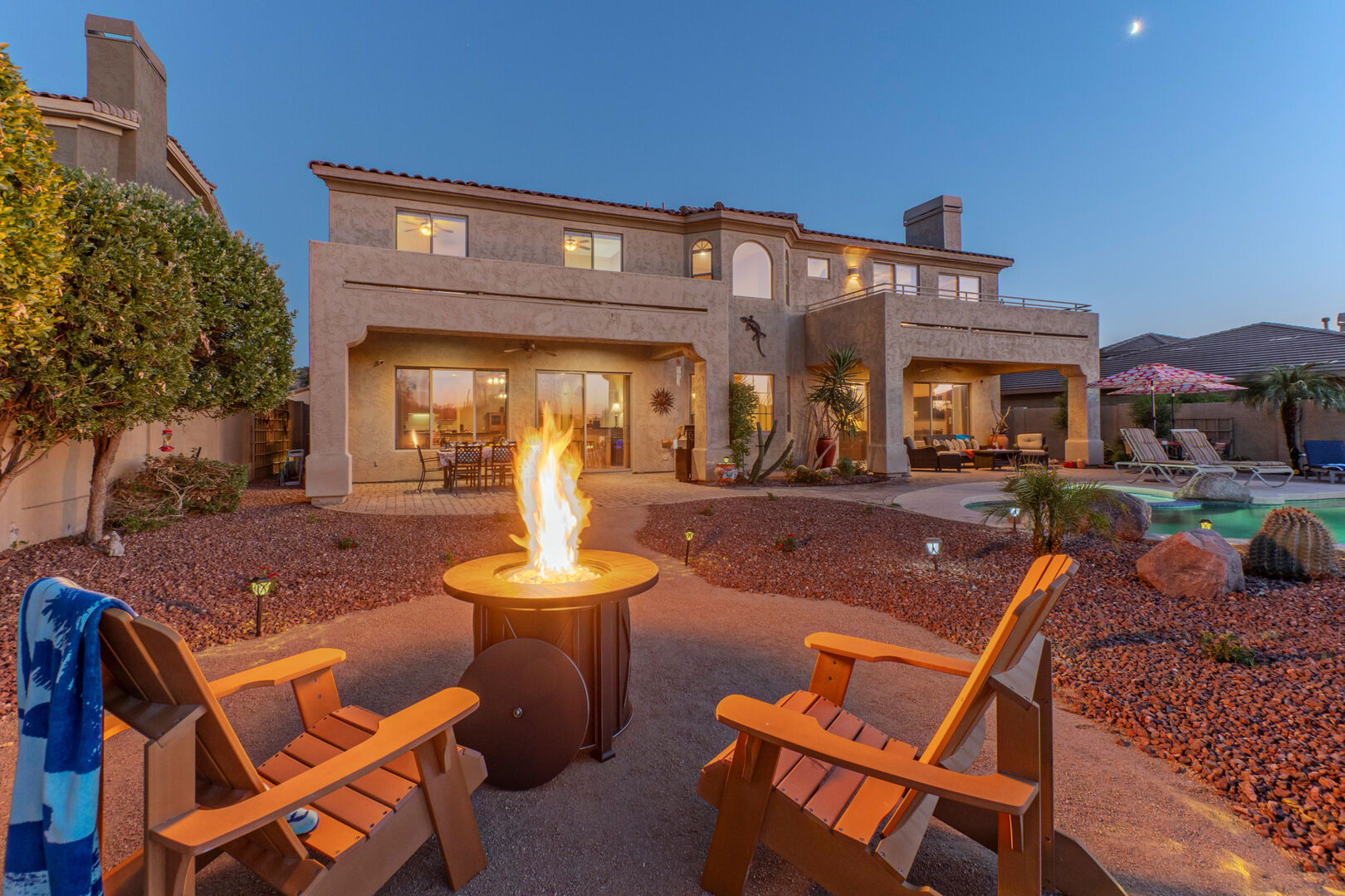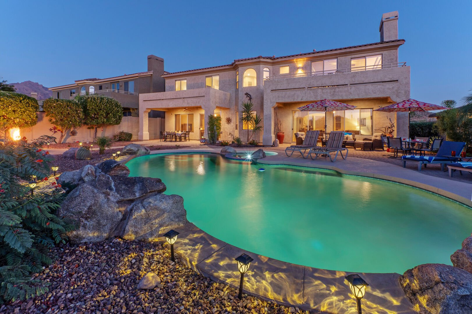 Welcome to Arizona Daydream, our 6 BR, 4 BA, two story, 5000+ sq ft home in beautiful and family friendly Gold Canyon. Enjoy the private backyard amenities that include a 9 ft deep diving pool with optional heat, built-in spa, fire pit and covered patio furnished for dining and relaxing. The pool heating fee is $85.00 per day to heat the pool to 80º F.