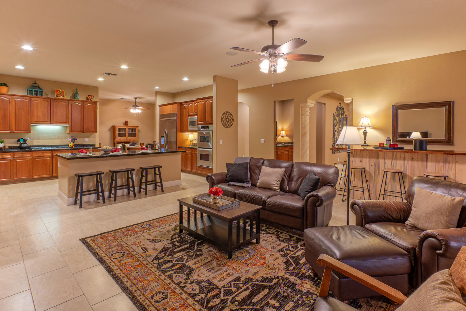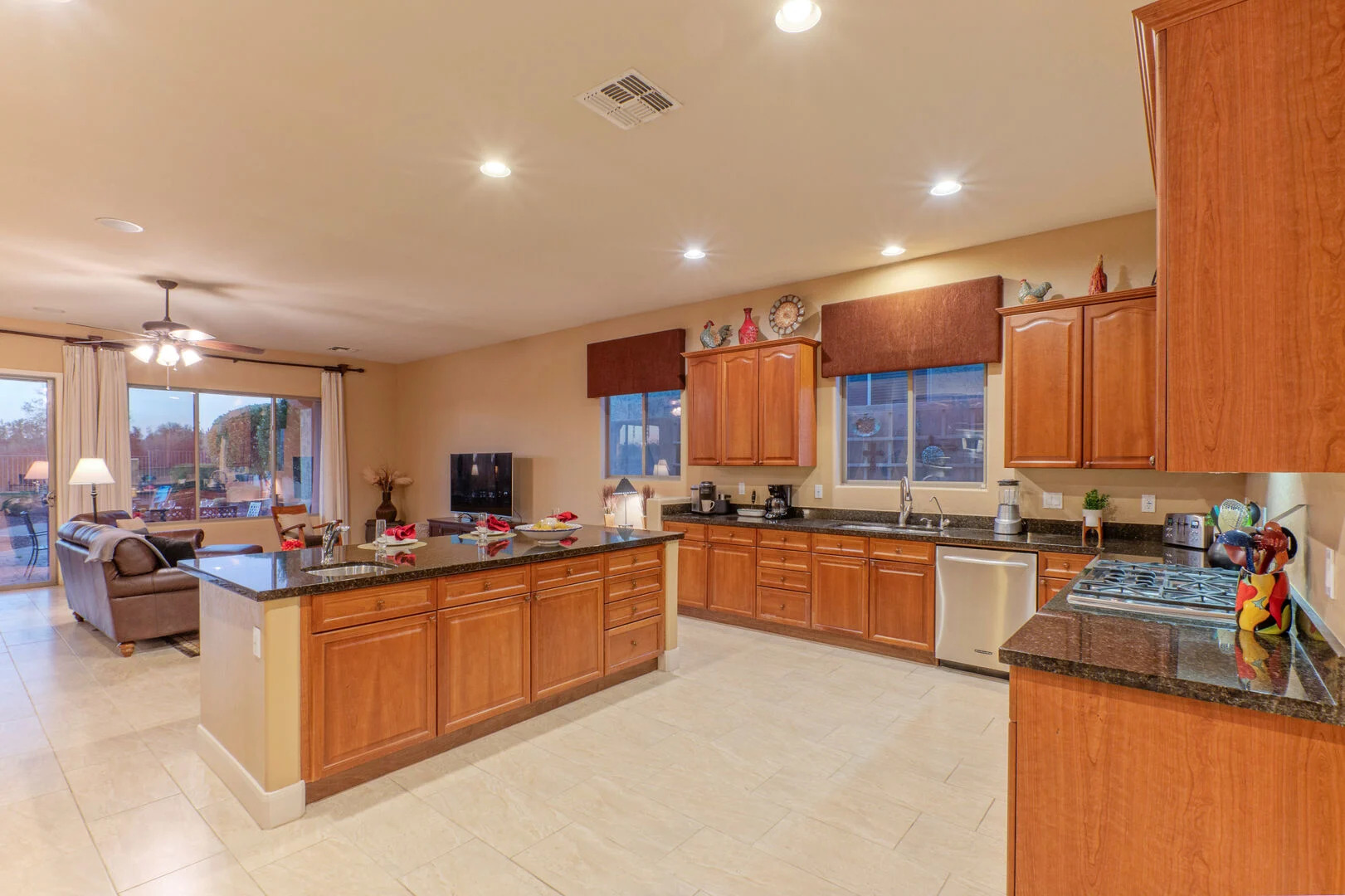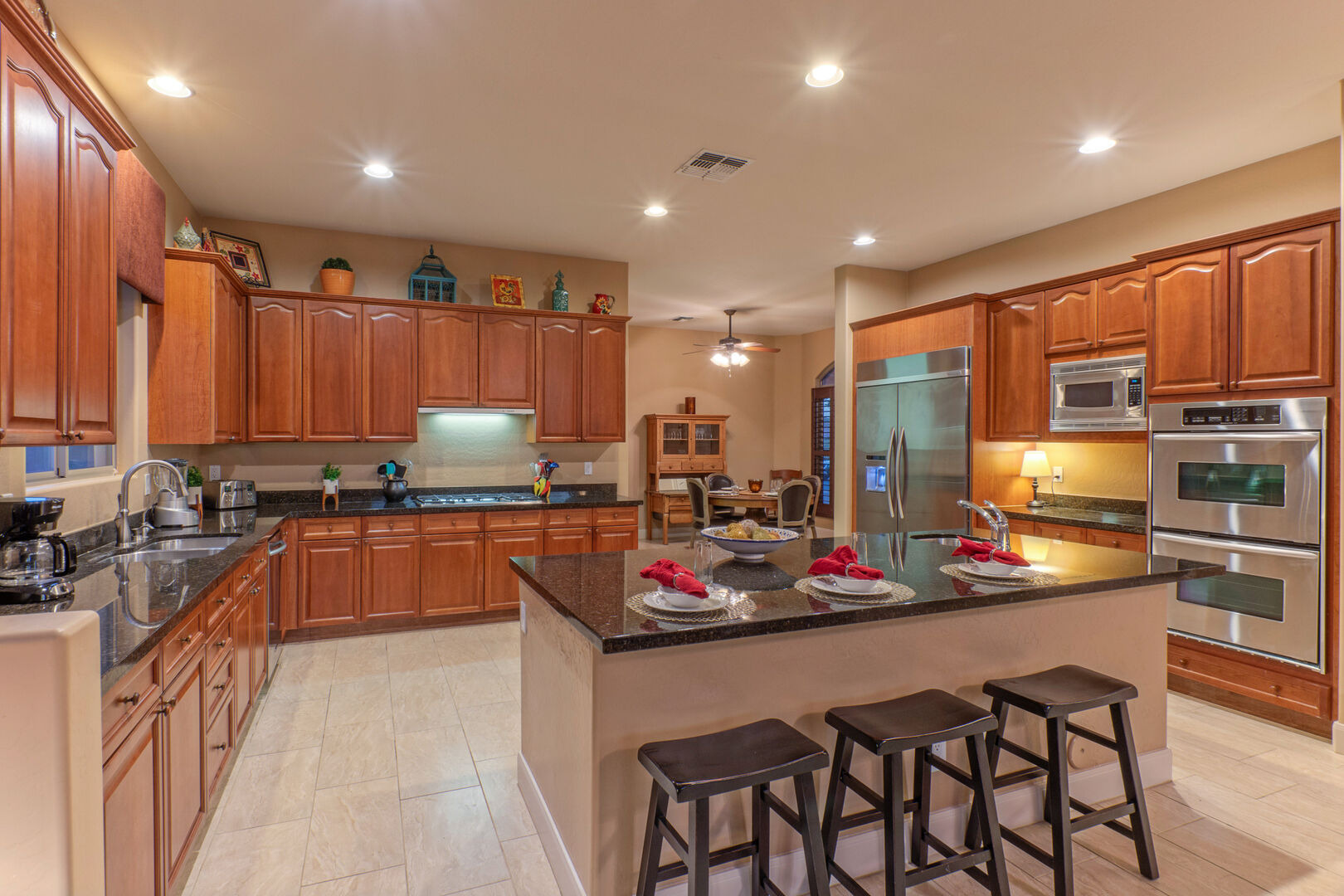 Our spacious home has an elegant living room with a gas fireplace and a formal dining room with table seating for 8. The open concept great room has a cozy sitting area, fully stocked kitchen and casual bar. The sitting area is furnished to comfortably watch the great room TV. There are doors that open to the pool deck and covered patio, making transfer of food and beverage easy. Wifi is complimentary.