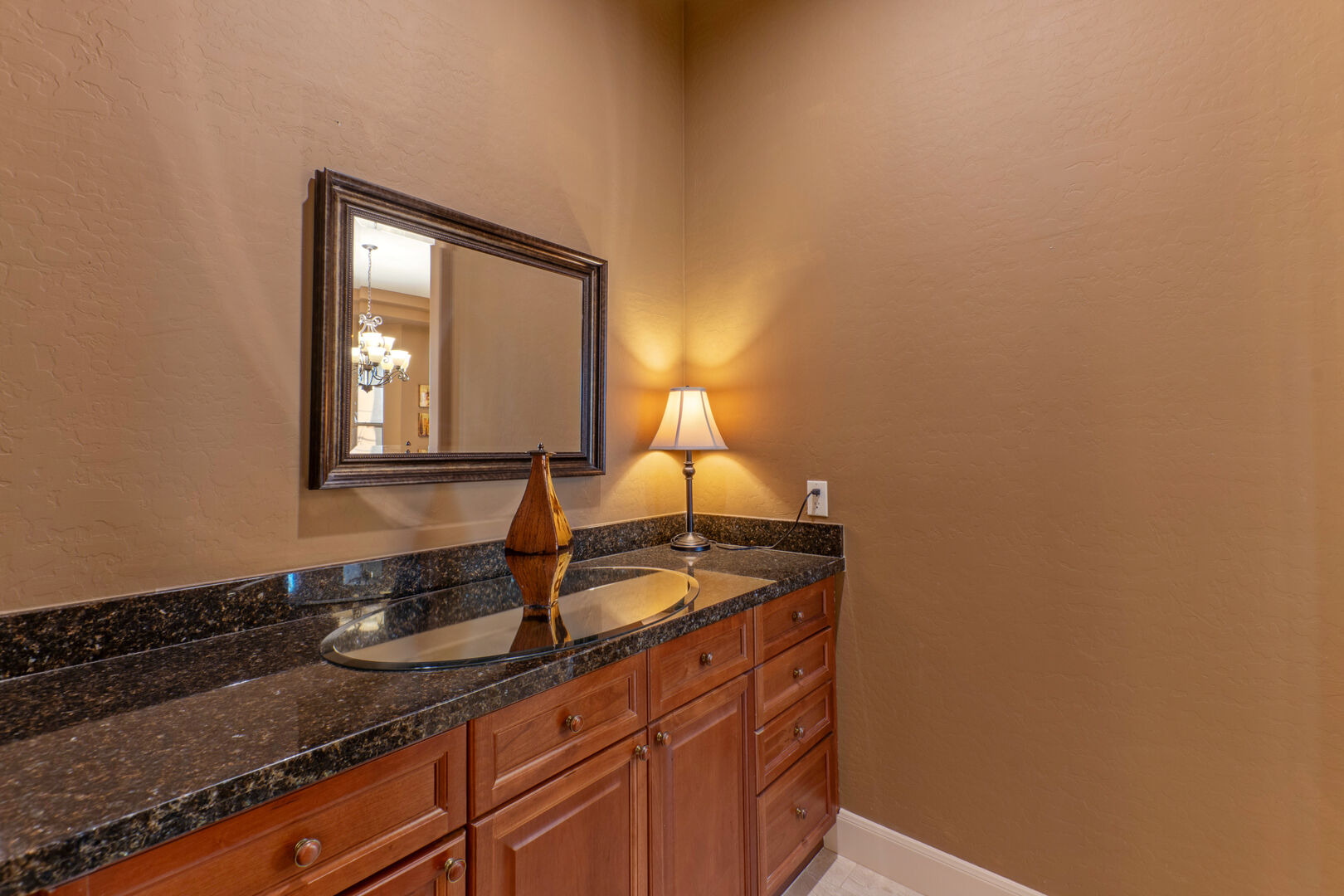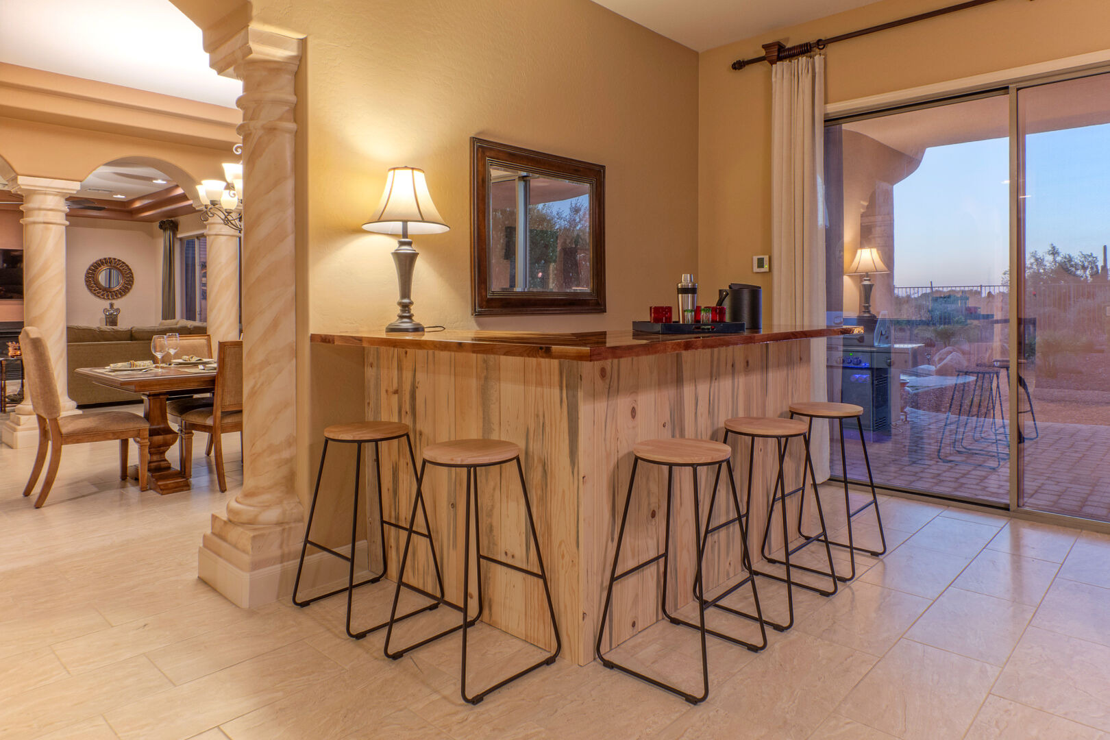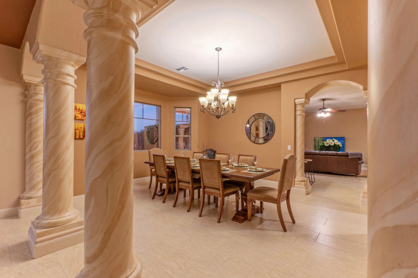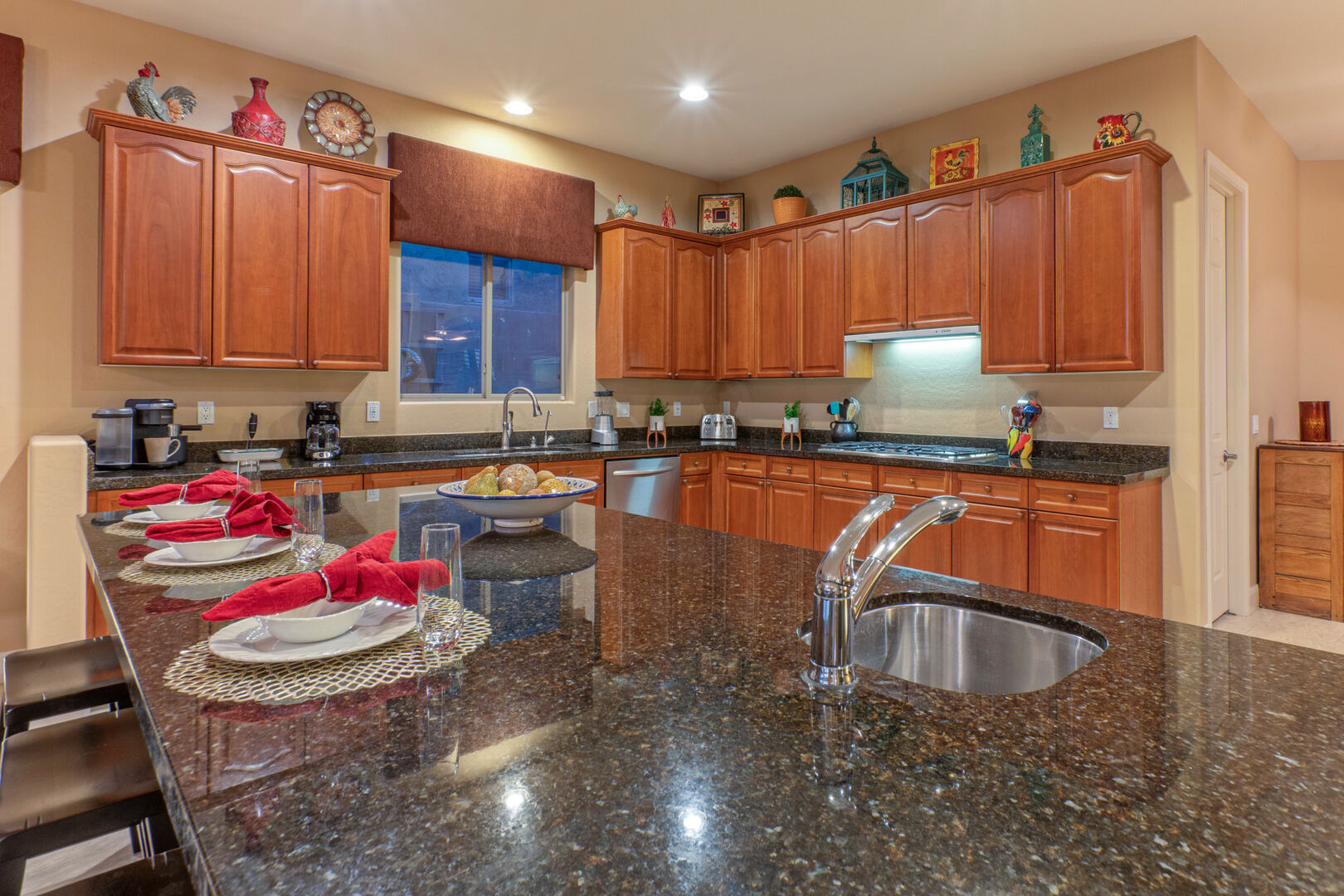 Our spacious home has an elegant living room with a gas fireplace and a formal dining room with table seating for 8. The open concept great room has a cozy sitting area, fully stocked kitchen and casual bar. The sitting area is furnished to comfortably watch the great room TV. There are doors that open to the pool deck and covered patio, making transfer of food and beverage easy. Wifi is complimentary.