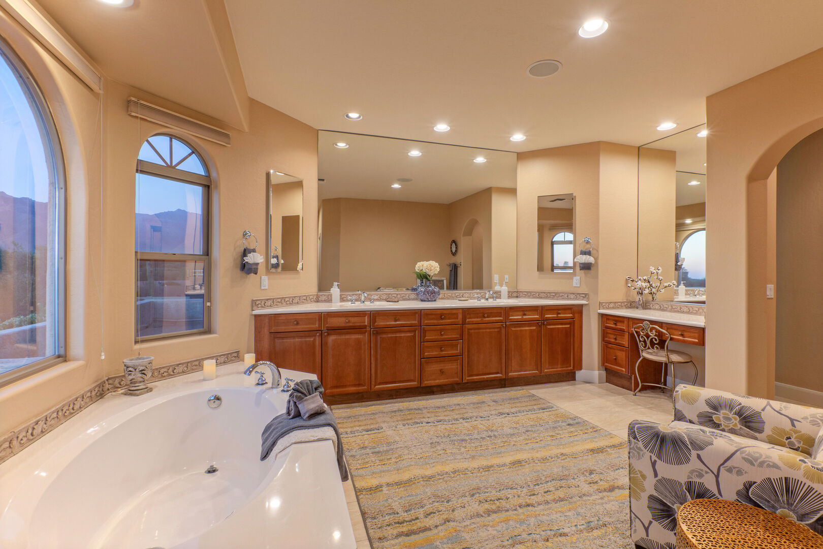 The luxurious primary suite has a king bed, balcony with pretty views, en suite bath, large walk-in closet and plush sitting area. The en suite bath features a garden tub for soothing stress and tired muscles, dual vanity sinks and a walk-in shower. A hair dryer and soap are supplied. Pack 'N Plays are available to rent.