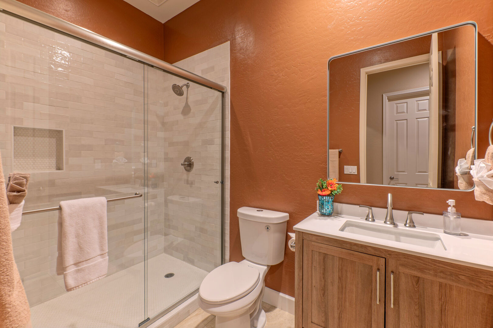 Bedrooms 2, 3, 4 and 5 have queen beds and share Bathrooms 2 and 3 with tub-shower combos. There is also an upstairs arcade room with 70 arcade games on 2 consoles, darts, a TV and a table for cards, board games and puzzles. Guests of all ages will enjoy playing arcade games on the consoles or rounds of darts. Bedroom 6 on the ground floor has a king bed and uses Bathroom 4 with a walk-in shower.