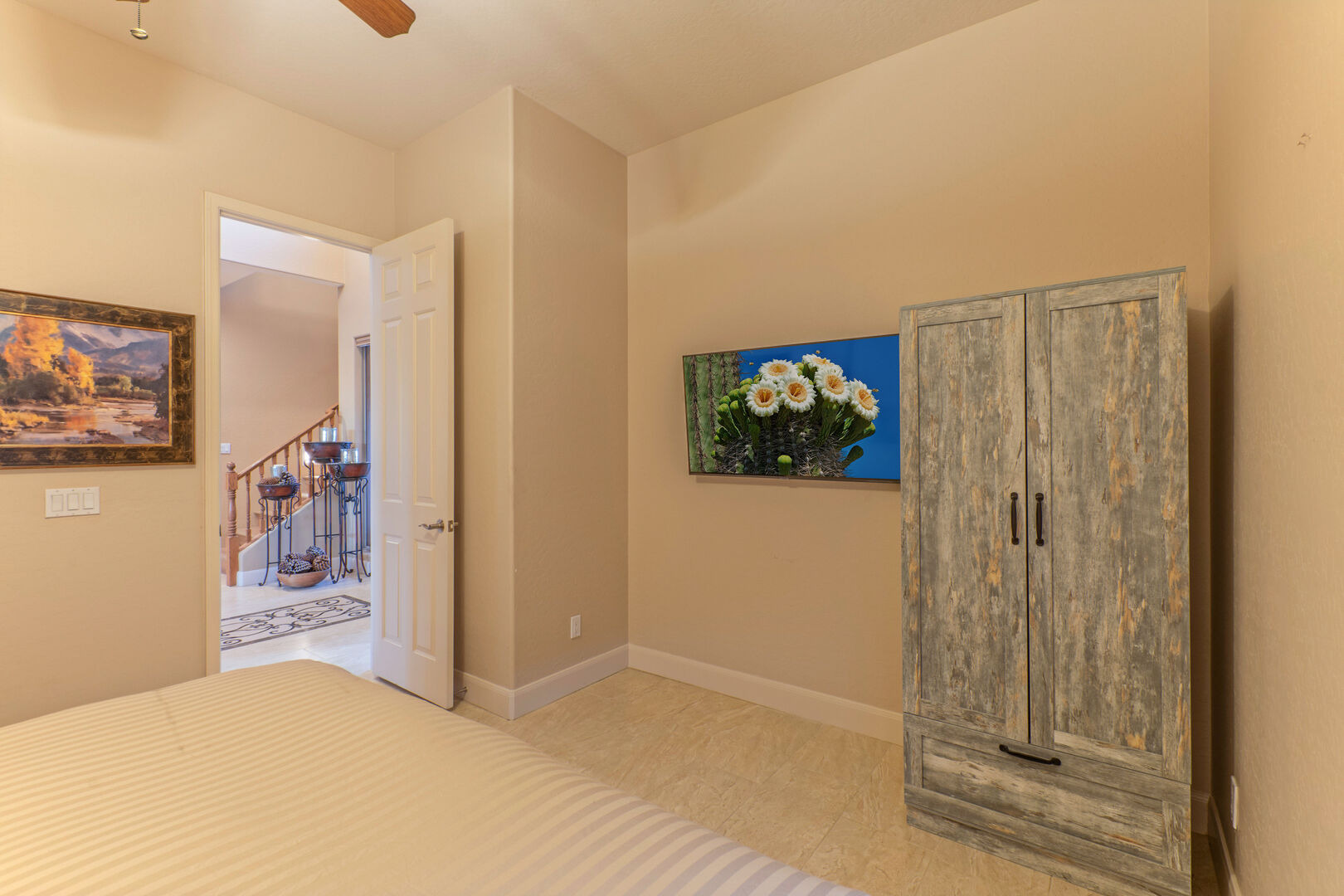 Upstairs are 5 bedrooms, including the primary suite, and 3 bathrooms. There is one bedroom and one bath on the ground floor. ALL bedrooms have TVs and ceiling fans.