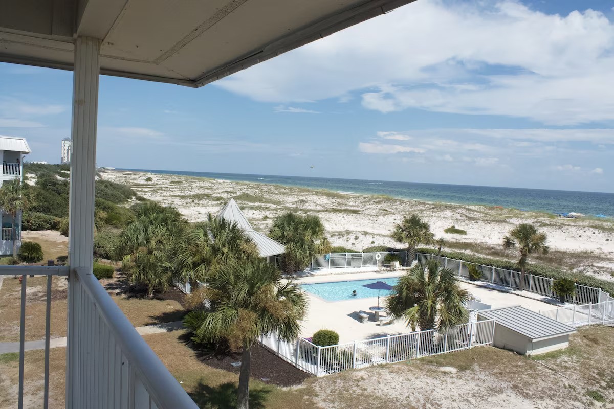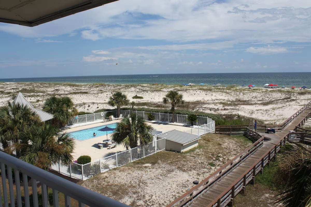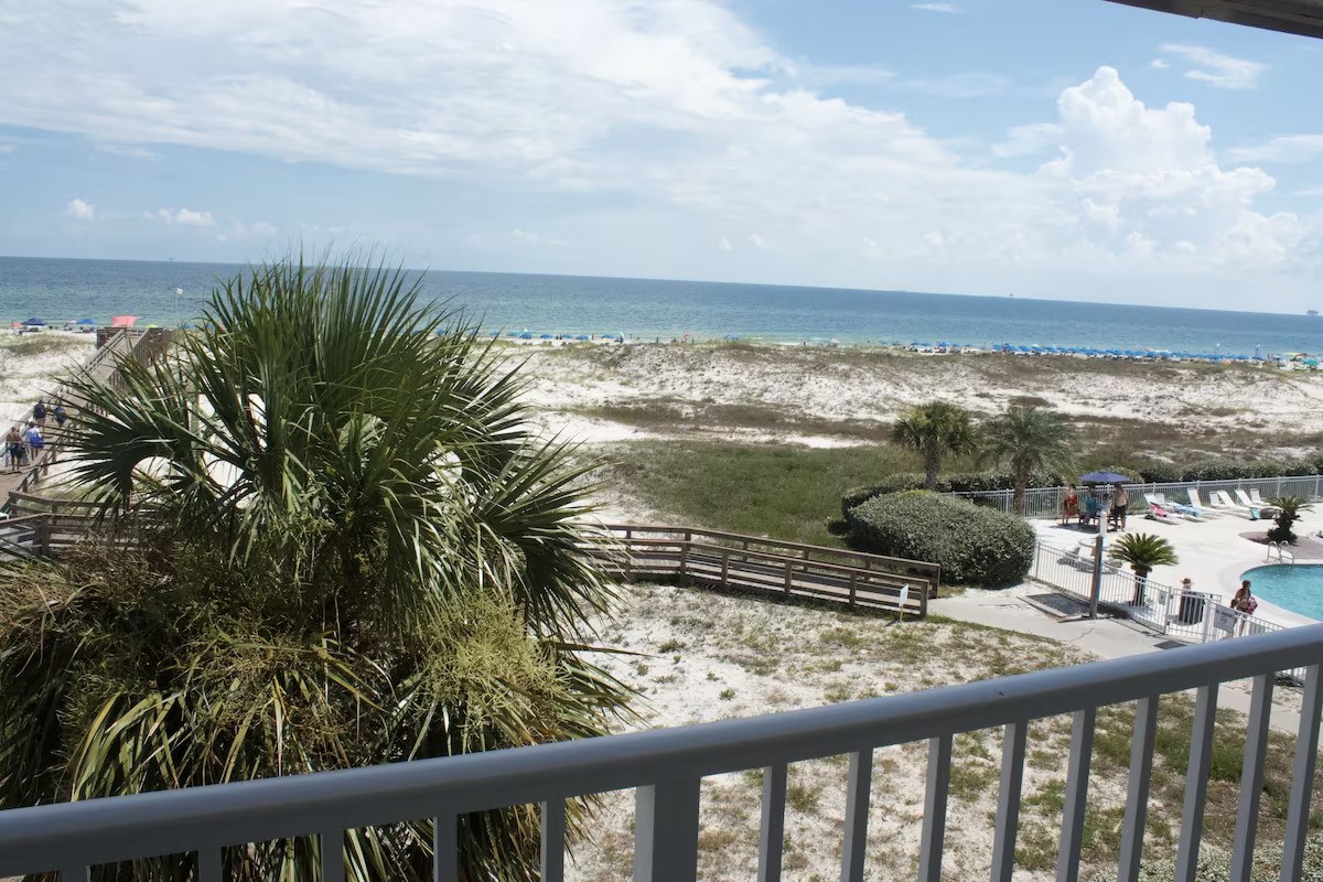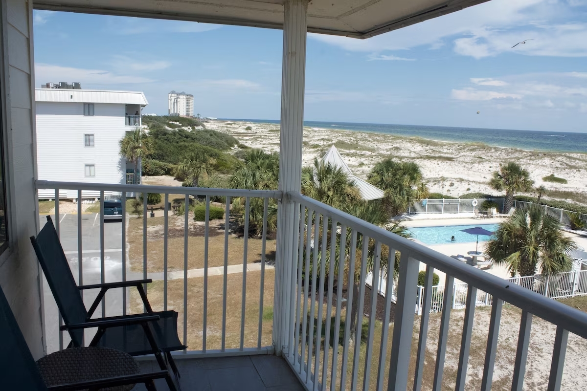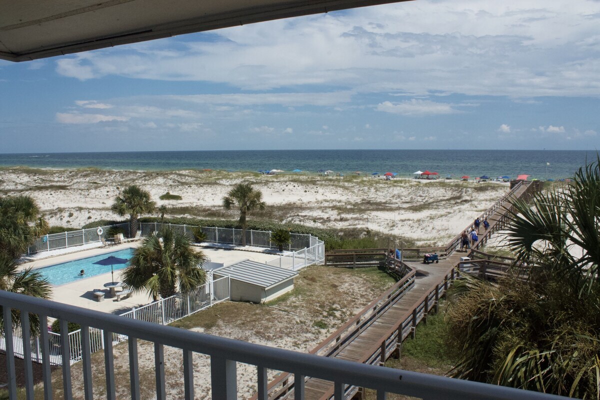 Gorgeous Gulf of Mexico View from this Beachside, Beachfront 1 BR 1 Bath w/ bunk. This condo sleeps 5 comfortably with a KING bed in Master, a twin bunk, and comfy queen sofa sleeper. RARE FREE PARKING! Spend your days at the white sand beach that is just steps away or hit the outdoor pool or the heated indoor pool and Hot tub. Work up a sweat at the fitness center or sauna. You are a short distance from Fort Morgan and a short drive to the hub bub of Gulf Shores or Orange Beach. Award winning Kiva Dunes Golf Club is right next door. Fishing at the Lagoon is across the street. There are several restaurants and a Dollar General a short distance from complex. Beach Essentials such as beach chairs, towels and sand toys are provided for your use along with a starter of shampoo, conditioner, dish & dishwasher soap, laundry pods, body and hand soap, toilet paper, paper towels, and garbage bags.