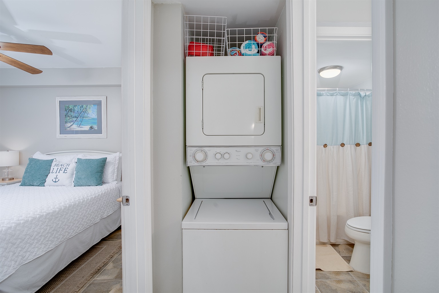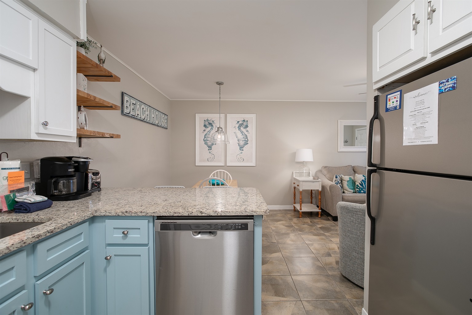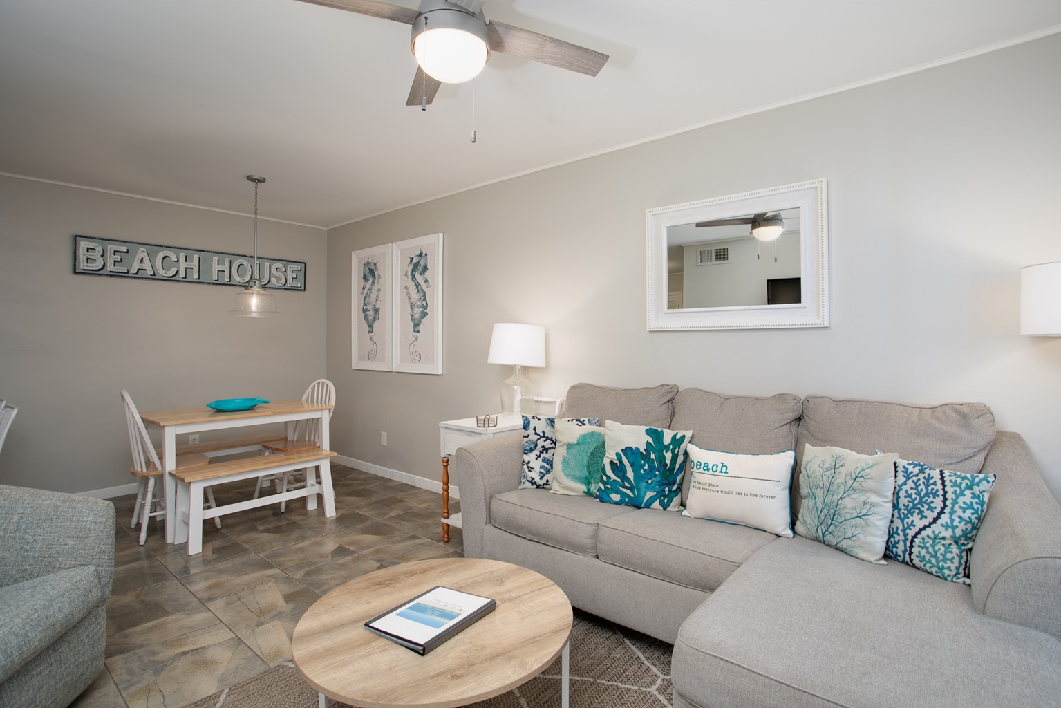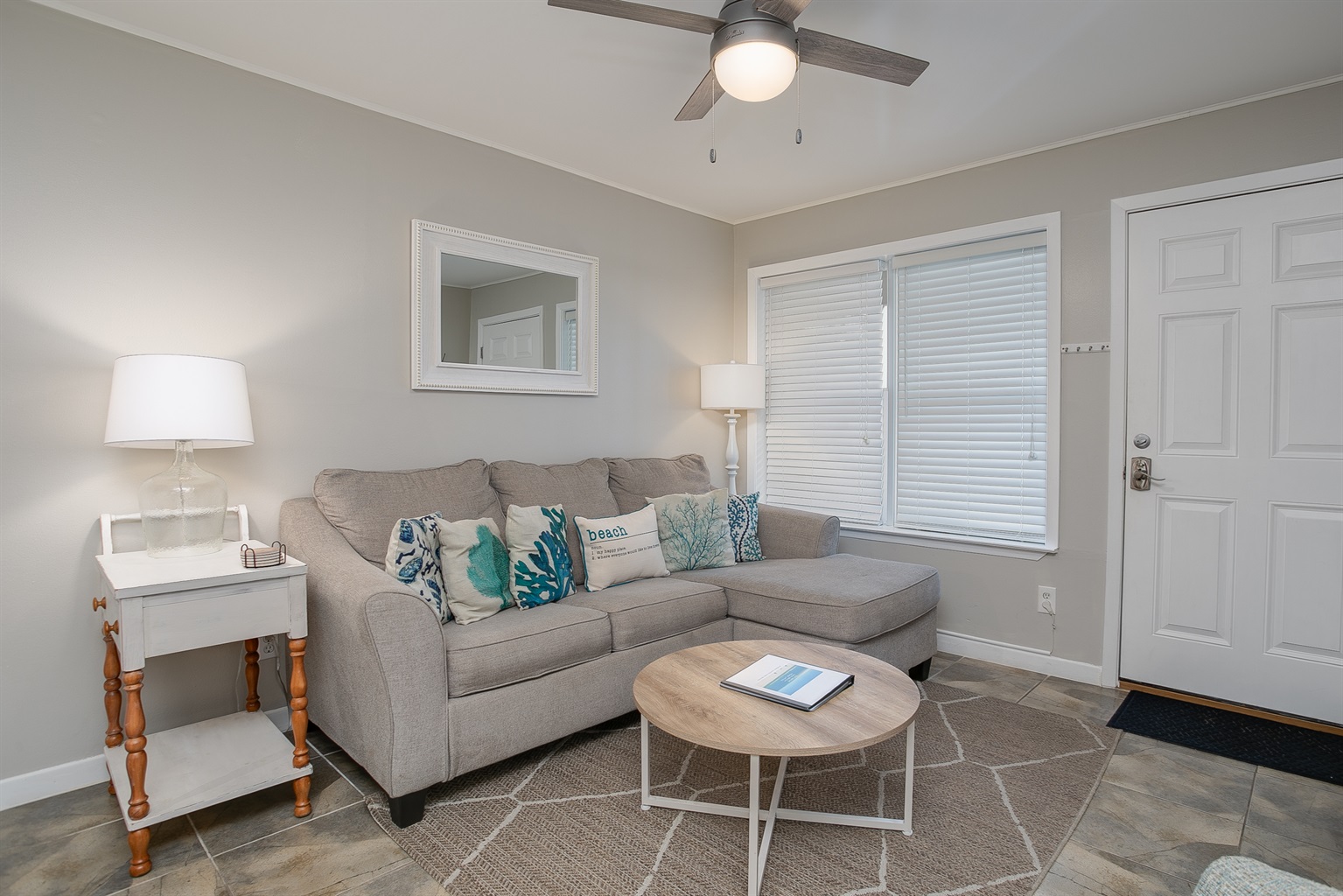 Condo was extremely clean. Not even a speck of sand inside. Beautifully decorated. Had everything we needed. Nice fluffy towels. Bathroom was very clean. Washer and dryer worked great. Outside was well lit. Stairs were very safe with handrails. Parking spaces were nice and wide for SUV parking. Trash bin was just beside parking lot. Had plenty of trash bags, paper towels, and toilet paper. Everything was as promised. Our family felt very safe staying in this condo. Couldn't hear traffic or noises from outside. Nice and quiet. Lots of food and shopping options nearby. Owner was great to work with, although I didn't need to contact for much at all because everything was great. The beach was just steps from the parking lot.