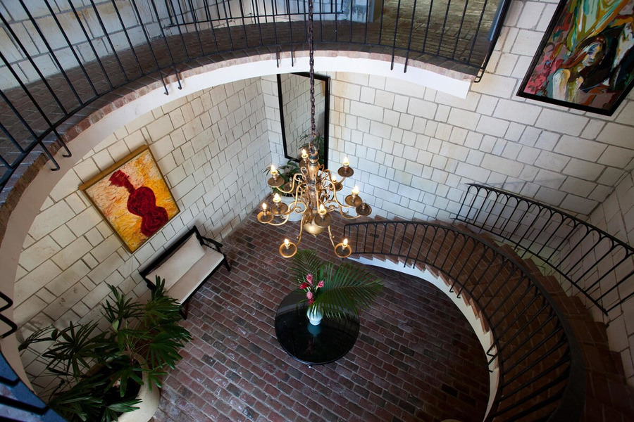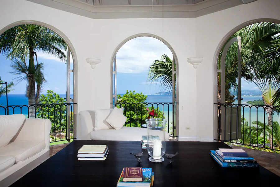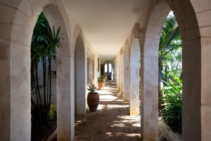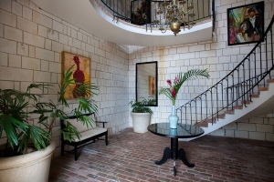 The house is entered through a wrought iron gate and double mahogany doors in to an impressive double level entry hall 40 feet high with antique brick floors and limestone walls. A semi circular staircase climbs to the main level of the house where on the west side there is a balcony with views of the Caribbean Sea and Round Hill and on the east side a large arched opening gives access to the main parts of the house through a covered walkway leading to the pool area.