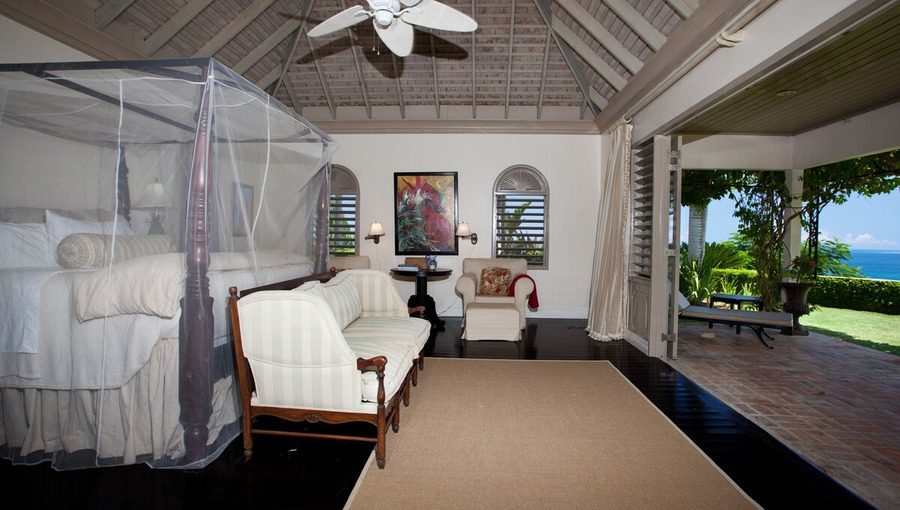 -Master Bedroom Suite - 4 poster king bedroom (28 x 19 ft) with an entry foyer and two dressing rooms and two bathrooms en suite. There is a private verandah off the master and a path leads to a private outdoor patio overlooking the Great River. The master bedroom has a 32 inch flat screen cable TV.