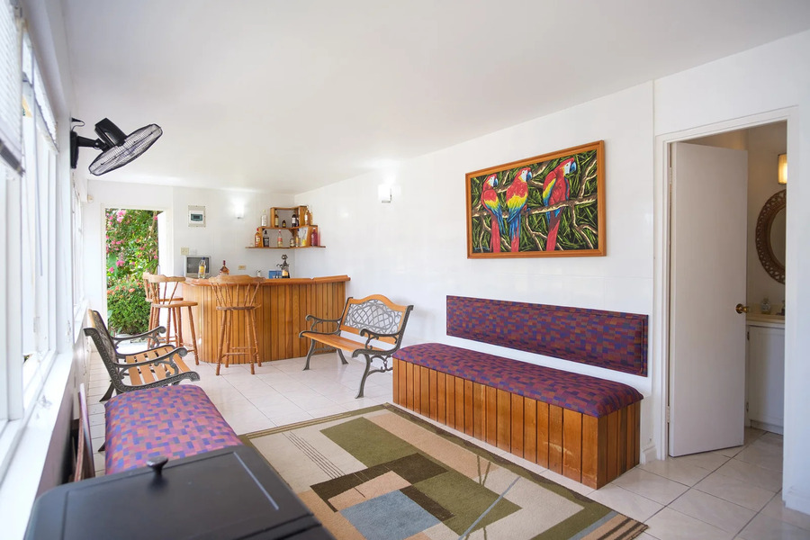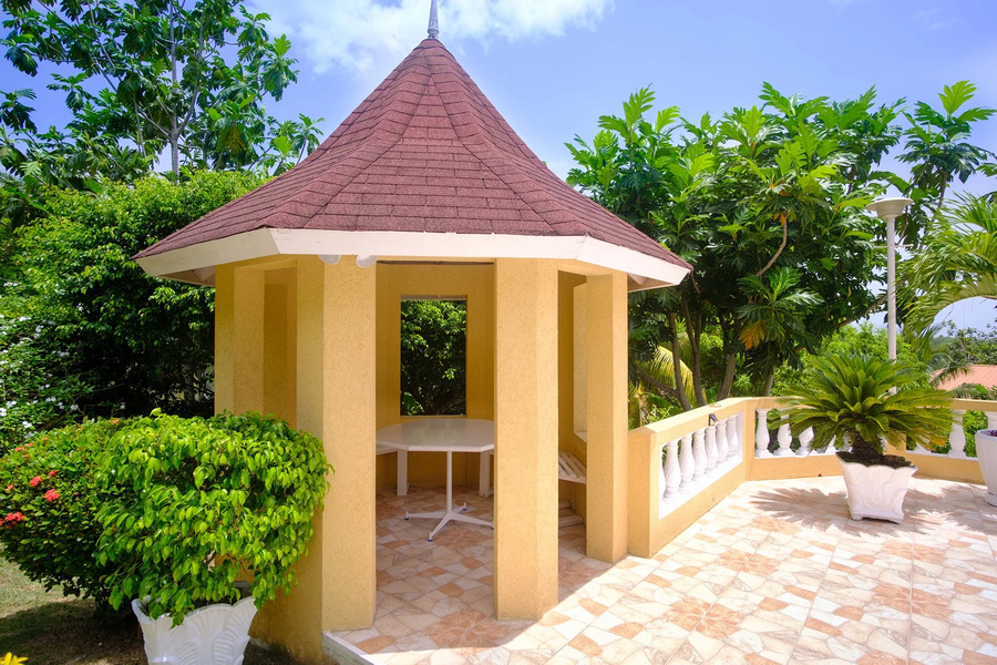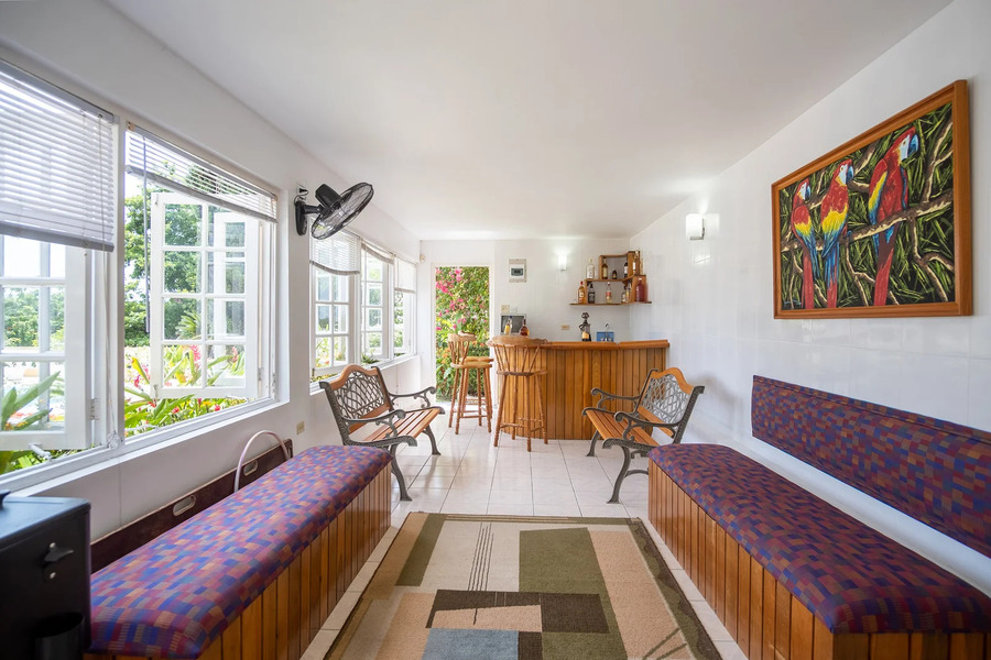 The swimming pool at Bogue Villa is beautiful and very expansive. The size of the pool is 60 x 30 feet; 3 feet deep on the shallow end and 6 feet on the deep end. The pool is surrounded by a tiled deck and has very comfortable lounges, chairs and umbrellas for those who wish to stay out of the sun. Surrounded by lush green foliage, the pool deck offers fantastic views.