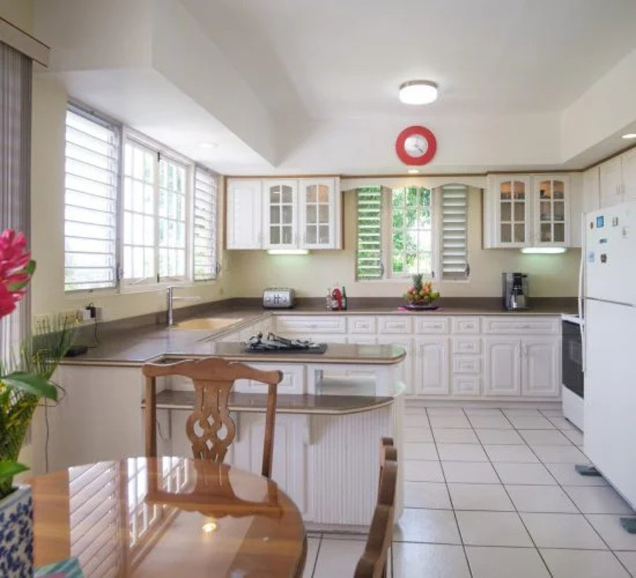 The living room at Bogue Villa is very spacious, with a spectacular view of Montego Bay. It is equipped with a 27’ television with cable services, stereo, DVD, CD and stereo. The comfortable furniture adds to the décor and makes it one of the coziest rooms in the villa. A book shelf contains several books that may be of interest to visitors to Jamaica, such as Adventure Guide to Jamaica, Essential Jamaica, Foods of Jamaica, Highlights of Jamaica, Insight Guides Jamaica. The living room opens into the dining room and kitchen.