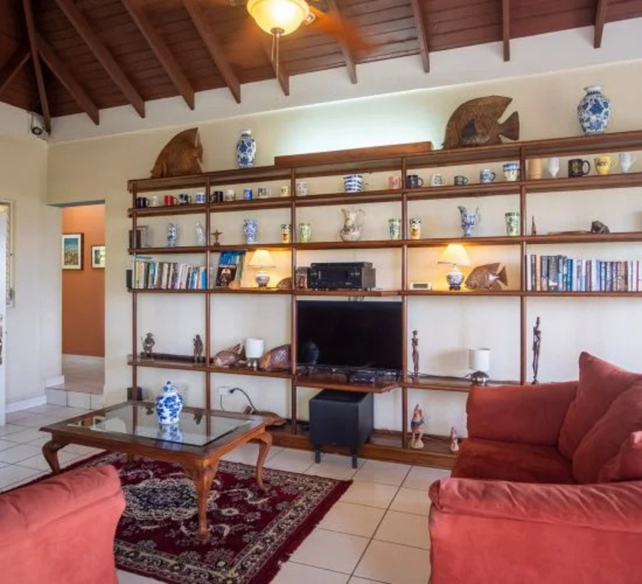 The dining room at Bogue Villa is equipped with a lovely wooden dining table that seats six persons, and has an entire wall with windows for fabulous views of the surrounding landscape. The outdoor terrace on the first floor offers dining and seating options with an even more spectacular view. Meals can also be enjoyed in the gazebo opposite the pool for complete relaxation.