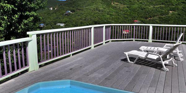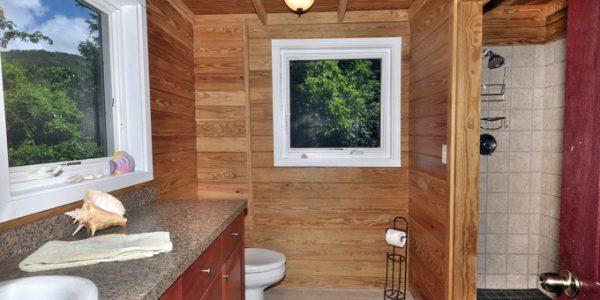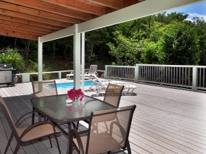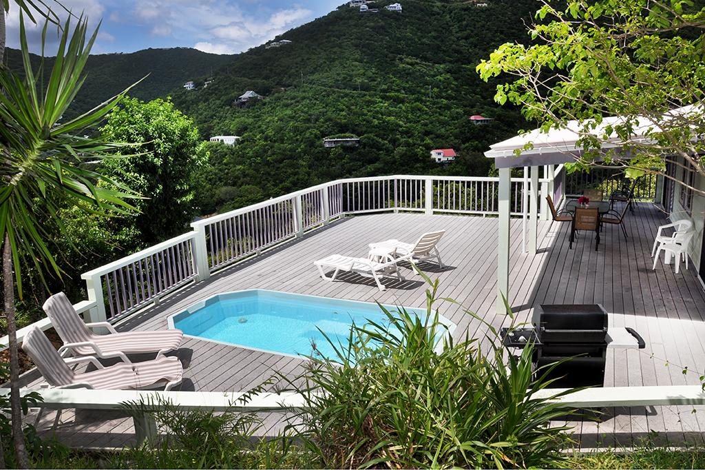 Fish Tales is a cute and comfortable two bedroom,with full new spilt AC units & 2 1/2 bath Caribbean Cottage with nice views of Fish Bay and the surrounding area out to Bovocap Point and Little St James Island. This spacious home away from home is easily accessed via a large flat driveway. Two small steps up from the driveway and you enter the home from a covered deck. The door leads you into the Air Conditioned Great Room with comfortable seating, TV, DVD player, and Stereo. Cable TV and APPLE TV and wireless internet are provided. The kitchen and dining area, as well as a 1/2 bath with full size laundry all flow easily off the great room. There is a sliding door that opens up to the large covered and uncovered pool deck. At the far end of the great room is the entrance to the master bedroom as well as the internal stairway to the lower bedroom. The large master bedroom has great views and a king size bed with a very comfortable memory foam mattress. A sliding door takes you out to the covered deck. There is a full, private, en suite bath in the master bedroom. The lower bedroom has a queen sized bed and a twin sized day bed with trundle that can expand the day bed into two twin beds or one king sized bed. All mattresses are very comfortable memory foam. There is a sliding door to a private deck with nice views of Fish Bay. There is also a private full en suite bath, closet, and small beverage refrigerator. This lower bedroom can also be accessed from its own entrance from an exterior stairway and deck.