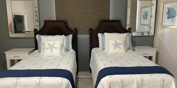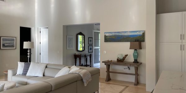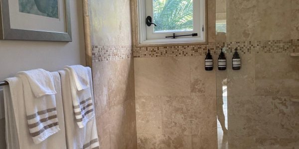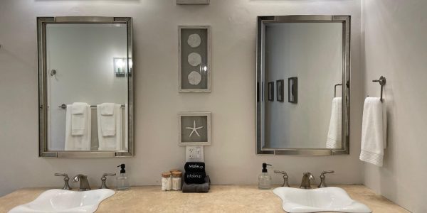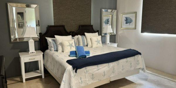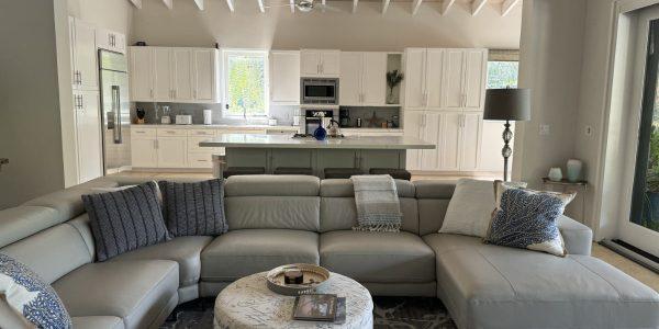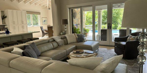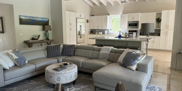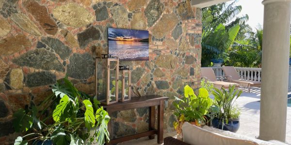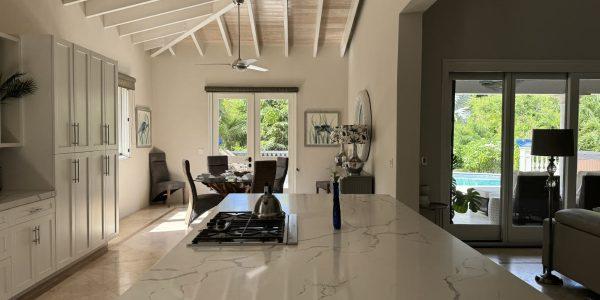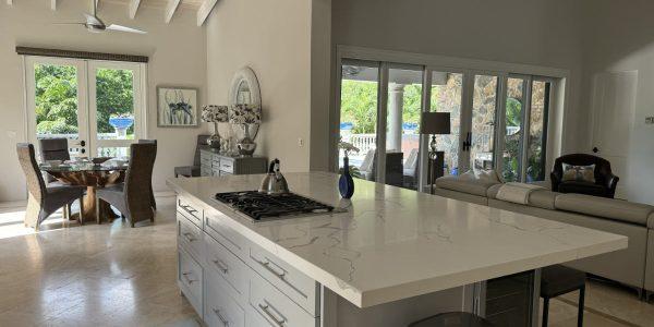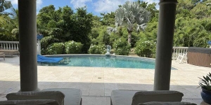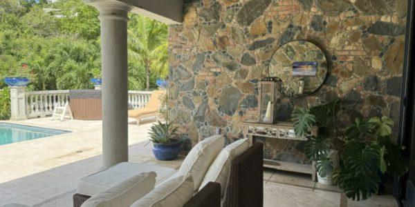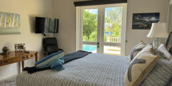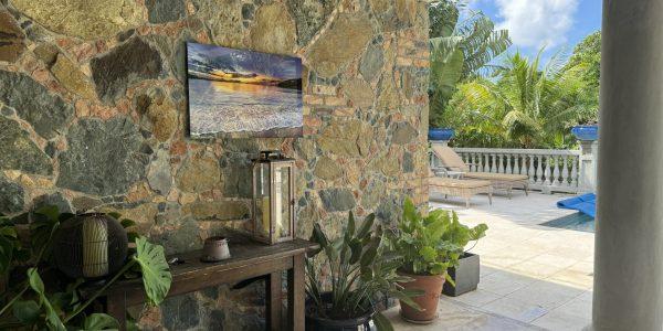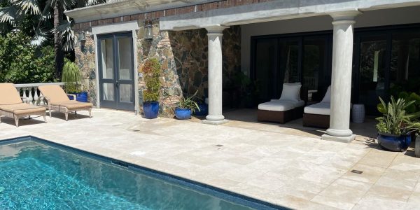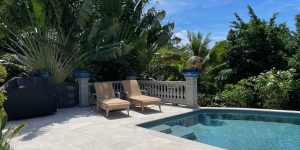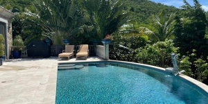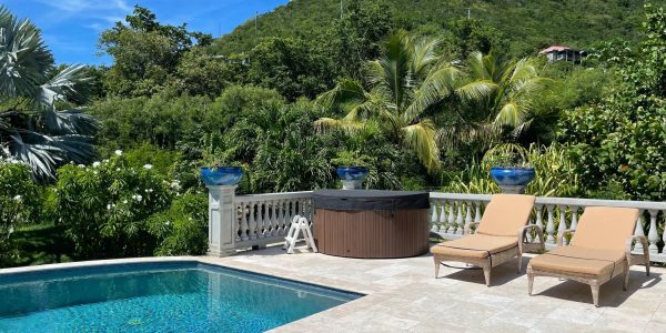 Holiday rates for Christmas week and New Years $4900. for a 7 night stay‘’Welcome home” to the Mystical Mermaid Villa, a consistently rated 5 star property. Consider a Flexcation – work remote while on vacation. There are high band WIFI throughout the villa and 2 desks; one in the living room and one in the primary bedroom. This luxury stone villa has been tastefully updated in today’s Caribbean colors and finished to the highest standards. Close to world famous beaches. There are 2 interior bedrooms, 2 baths, salt water pool & hot tub with mountain views. The primary suite has a king bed, AC, satellite TV, large ensuite bathroom. The second bedroom has two twin beds (can become a king bed), AC, and an ensuite bathroom. The floor plan includes an open kitchen, living room and dining room. The kitchen is fully equipped and has all the finest top-end appliances, AC, cookware, glassware, dishes, utensils & silverware. The dining room accommodates 6. The centrally located living room comfortably seats 6 with AC, an entertainment center and WIFI. The pool veranda opens off the living, dining, and owner’s suite. There is ample outdoor seating around the pool and beautiful mermaid fountain. Mystical Mermaid Villa is surrounded by lush gardens and Bismarckia palms. The pillared stone entry has a large flat turnaround car park for several jeeps. Beach equipment provided: cooler, snorkel gear, beach umbrella, tent and chairs. Villa has back up power in case of an outage.