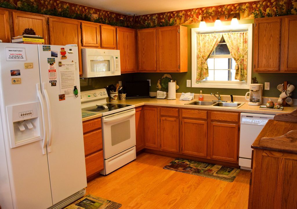 The open kitchen is complete with all the amenities of home to make a complete meal. The separate dining room has seating for a party of 6 with an oval table, that can also handle the challenge of a large jigsaw puzzle.