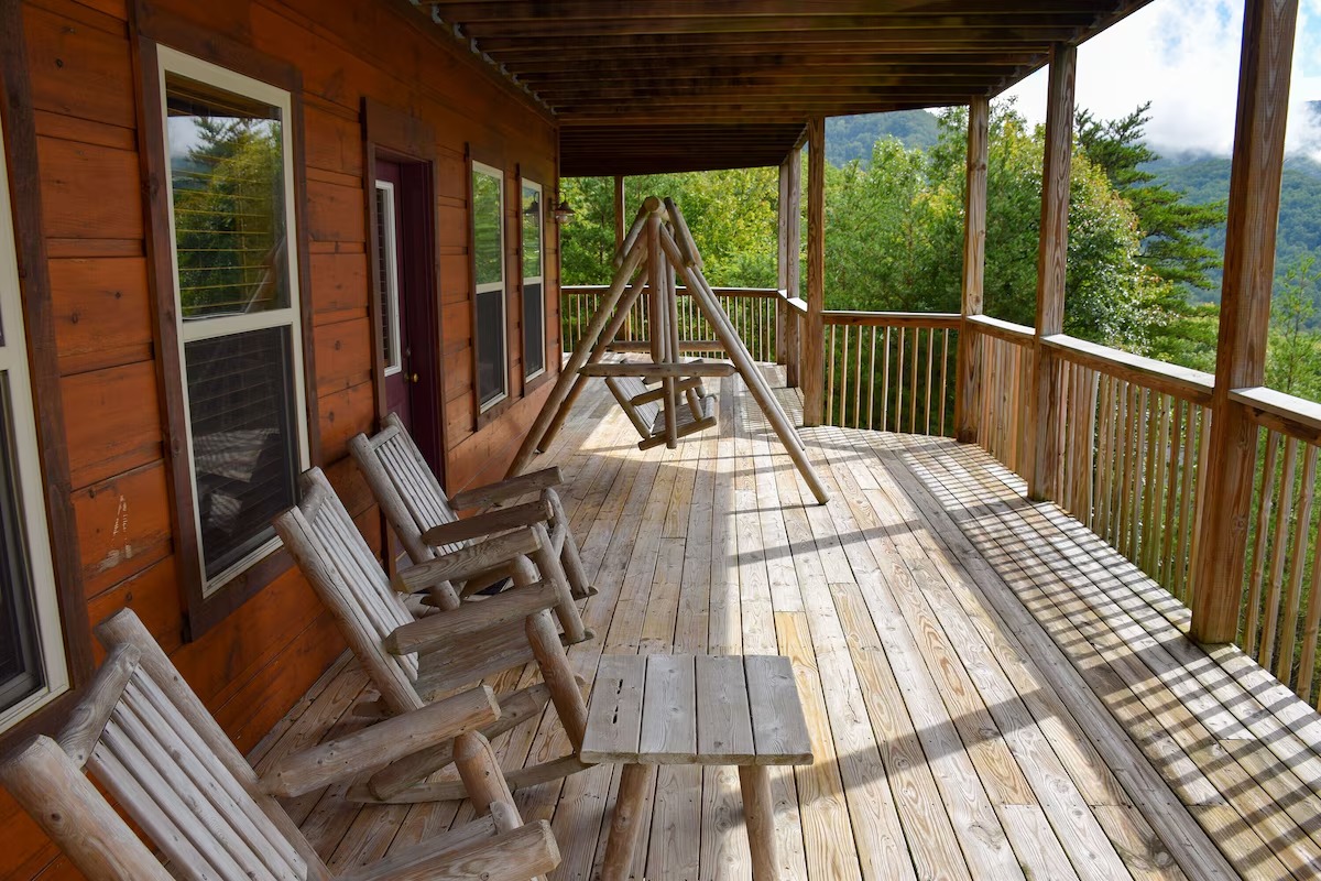 The double decks offer plenty of room for all, both large and small. Ample chairs and even a porch swing allow the adults time to visit, as a child scoots by on their ride-on toy. Both covered porch seating and sunny open decks provide means to enjoy all forms of weather. Use the charcoal grill for the start of your alfresco meal on the oversized, built-in picnic table. Or after all is quiet, immerse yourself in the swirling hot tub with evening nature surrounding you.
