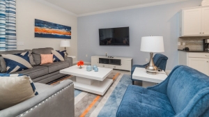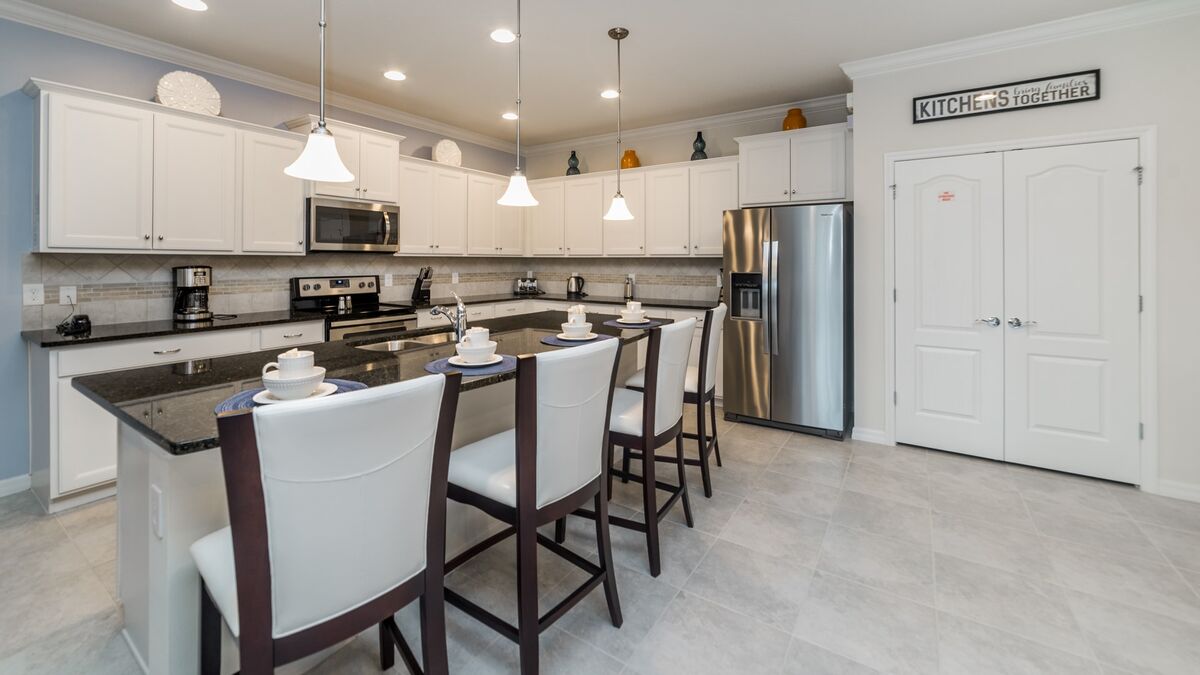 The comfort and luxury of this home start in the spacious kitchen. With granite countertops, stainless steel appliances, and white wooden cabinetry, this kitchen will surely allow you to cook and enjoy a mid-day snack or a full 5-course meal in its two, eight-person dining room tables. Also, the kitchen looks right over the living room which features a wraparound couch and a 65” TV.