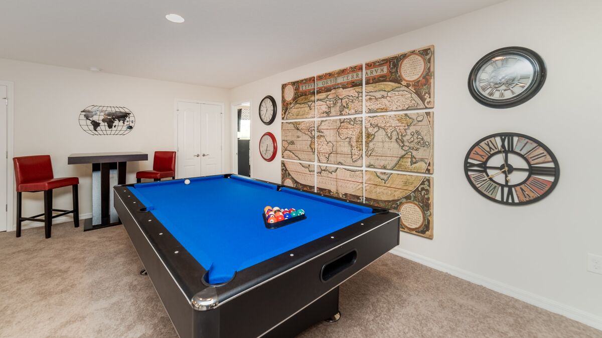 Heading upstairs, the game room provides plenty of entertainment with a wraparound couch, a 65” TV, a pool table and a foosball table allowing everyone to pick their favorite thing to do. This gorgeous vacation home also offers a movie theatre, a private pool and spillover spa with sun chairs laid out and ready for your delight. Free WiFi is available at the guests' convenience.